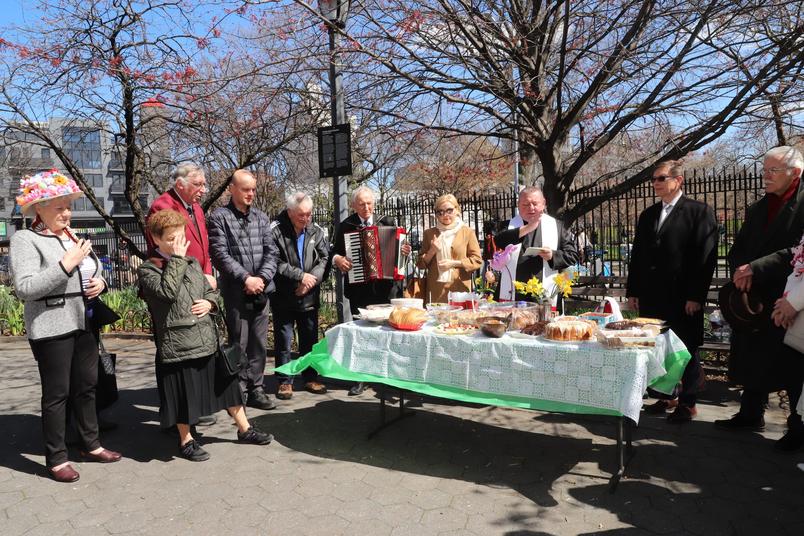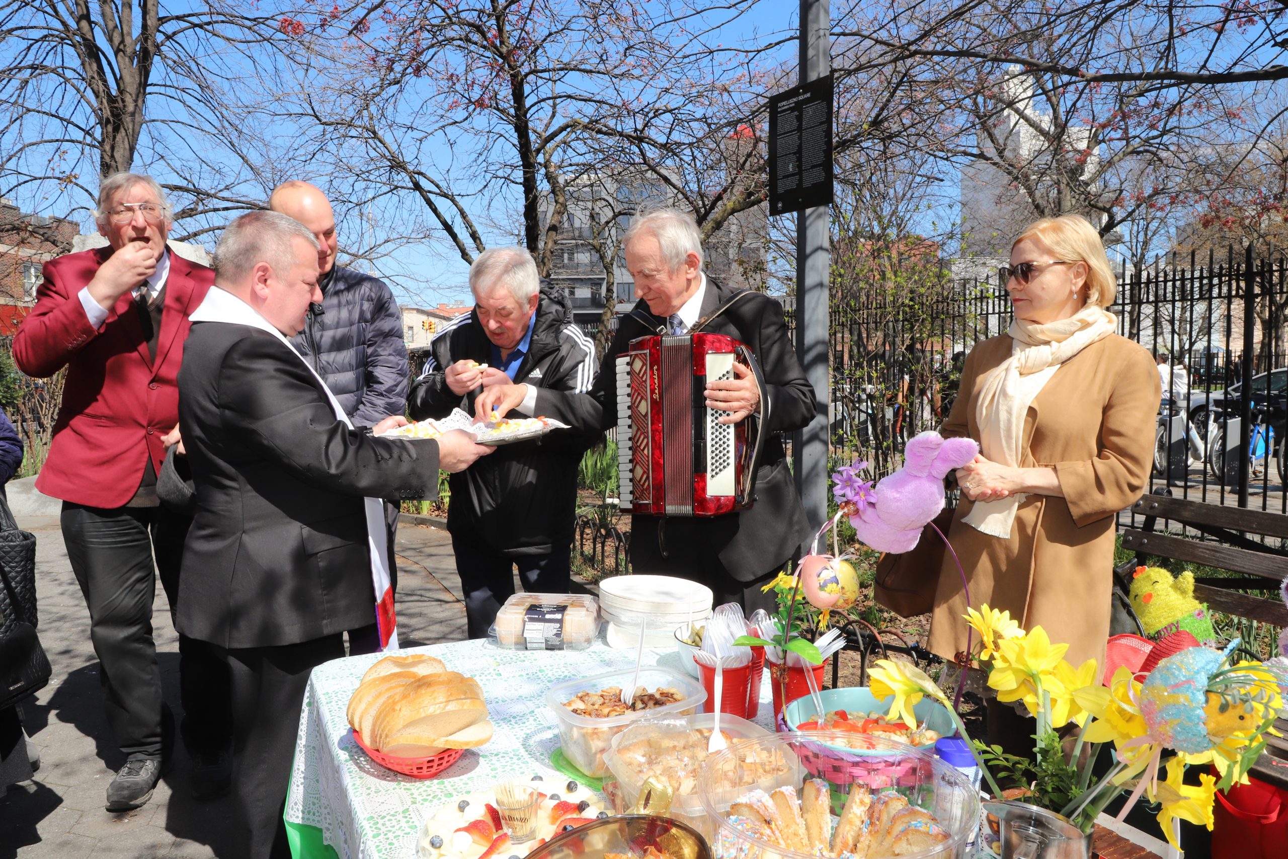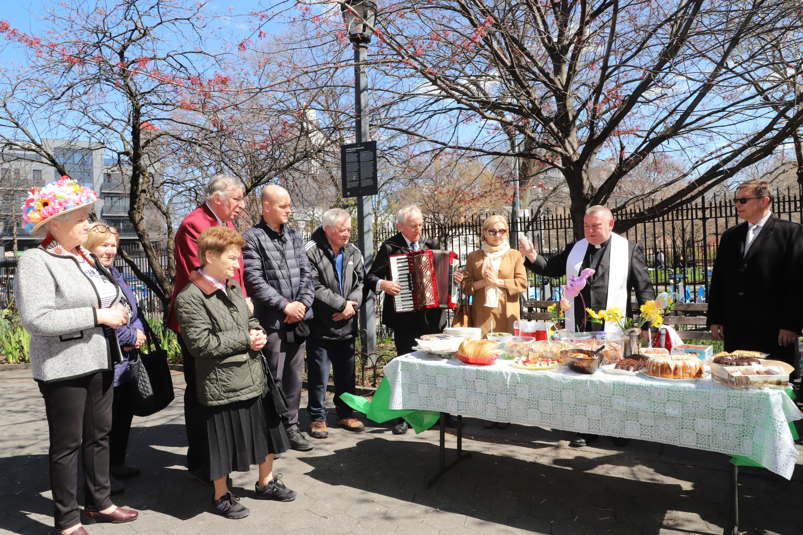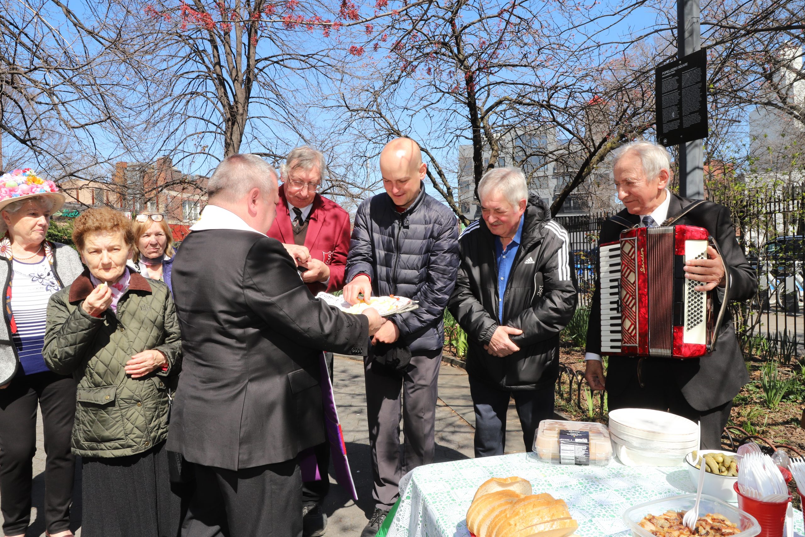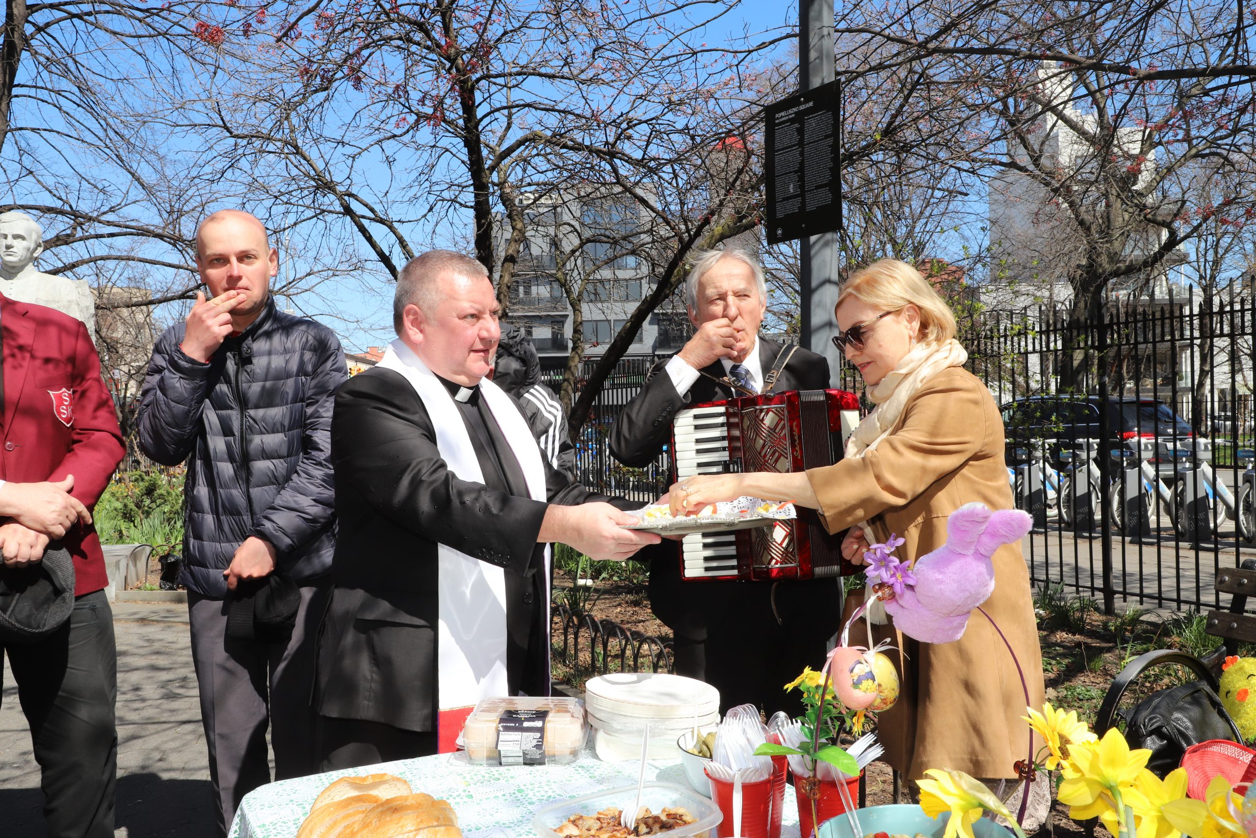 On the initiative of the seniors of the Krakus Club operating in the Polish Slavic Center, on Easter Sunday, March 31, the third meeting took place at the monument of Father Jerzy Popiełuszko in Greenpoint. Members of the Northside Senior Center from Williamsburg, friends and passers-by also attended. We were honored with the presence of: the president of the Polish Slavic Center, Marian Żak with his wife Małgorzata, the new president of the Polish-American Photography Club, Dariusz Kanarek, who came with his father, Krzysztof Kanarek, a former singer from Masovia and soloist of the Warsaw Operetta. Invited priest Grzegorz Markulak, parish priest of St. Stanisław Kostka in Greenpoint said: “After the end of the 40 days of Lent, we gather for the Feast of the Resurrection of the Lord. There is great joy in our hearts because Christ lives and is among us. Together with him, we are here in this community at the Easter table to share love, wish each other, and share the blessed egg, a sign of new life. Let us ask Christ, always present among those who love Him, to bless the food on our Easter table. After reciting the Litany of thanksgiving and prayers, he blessed the Easter food and those gathered.