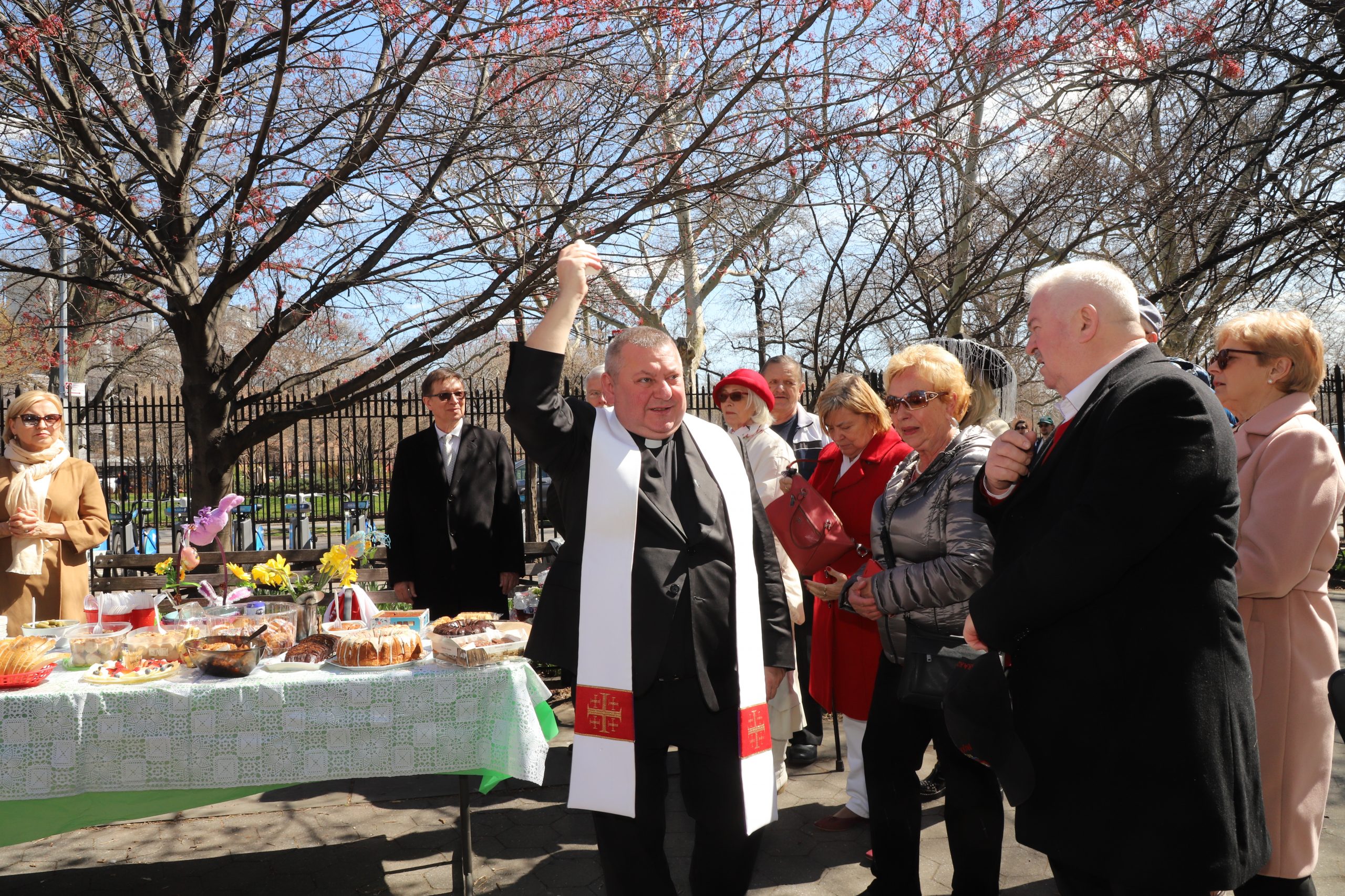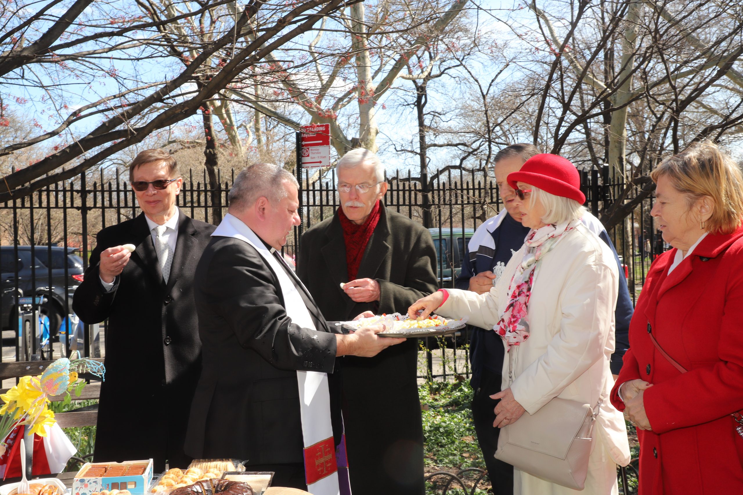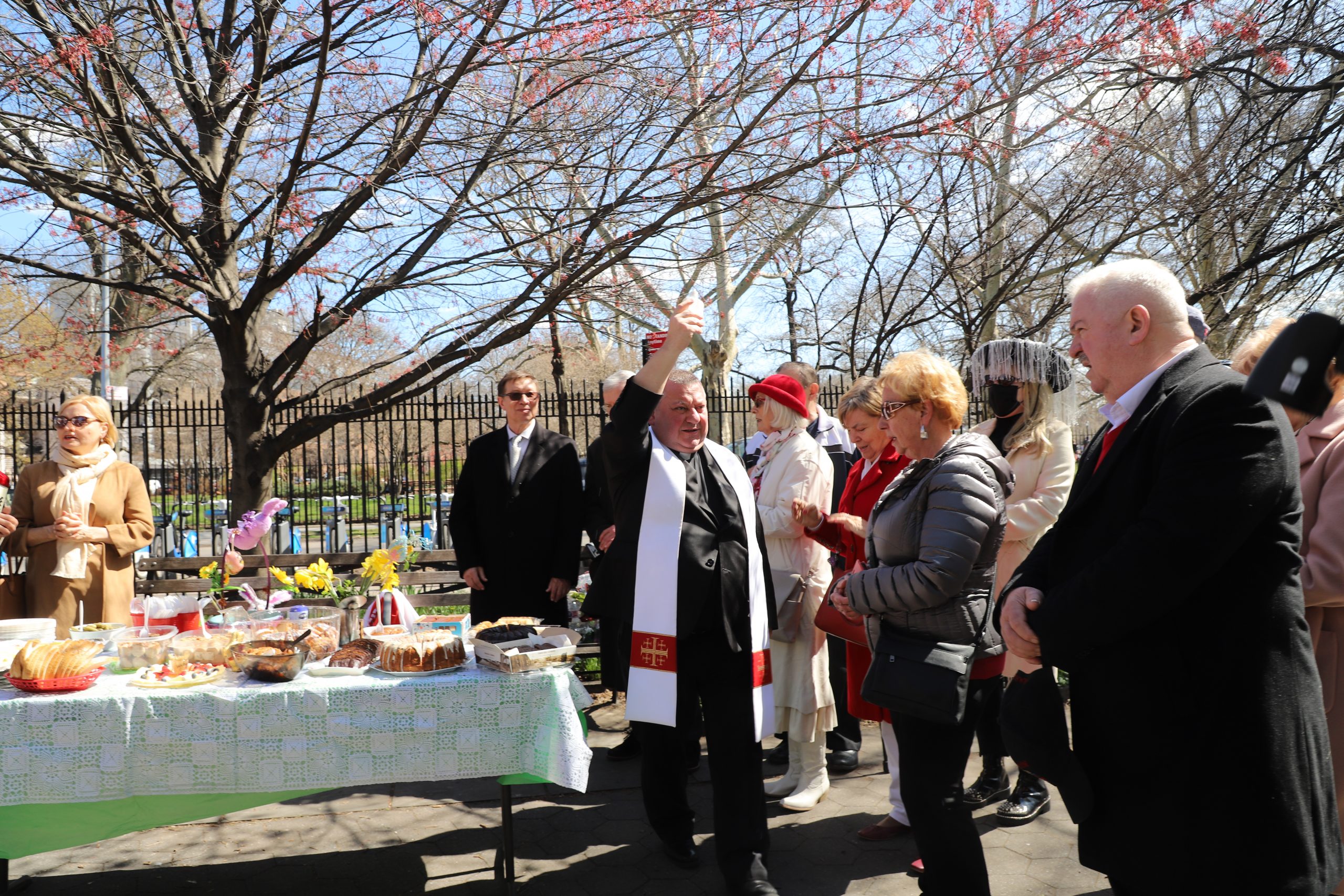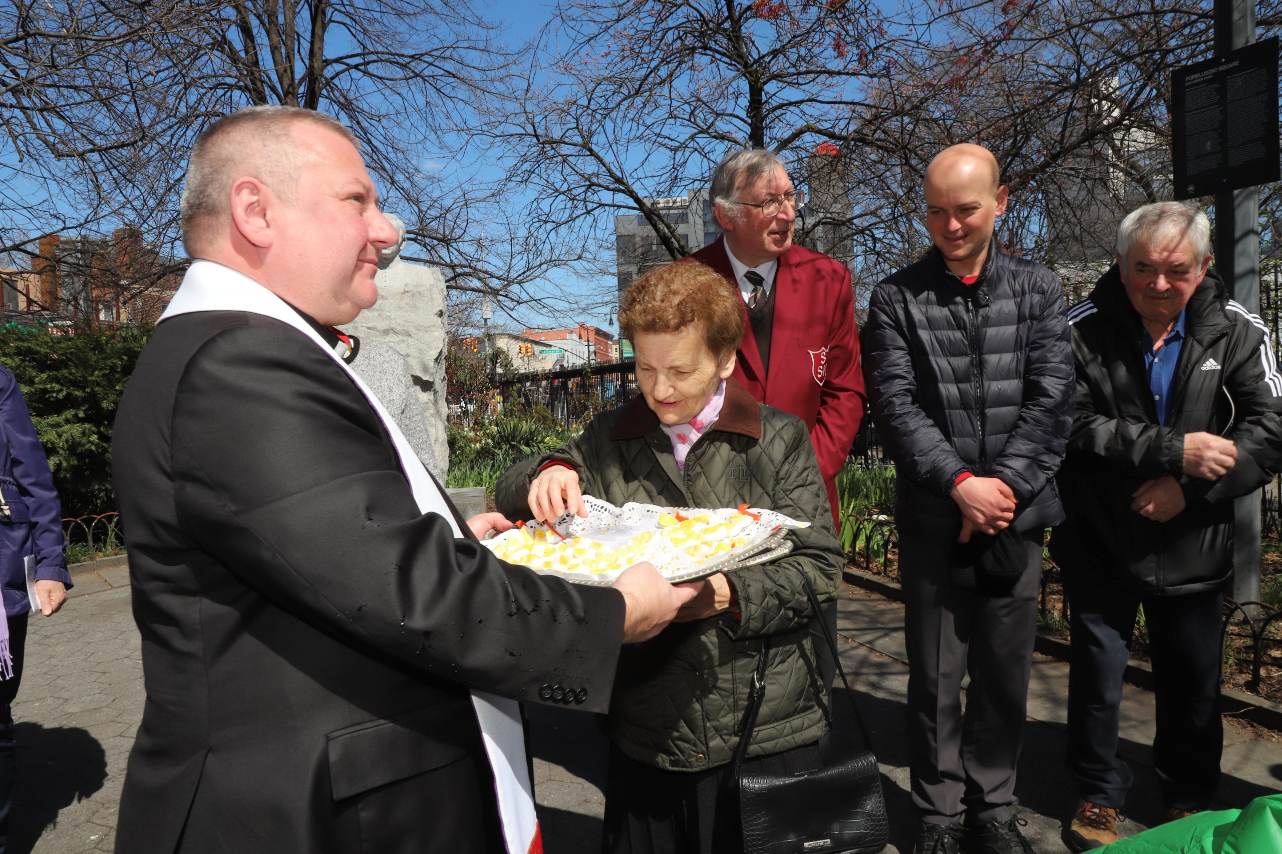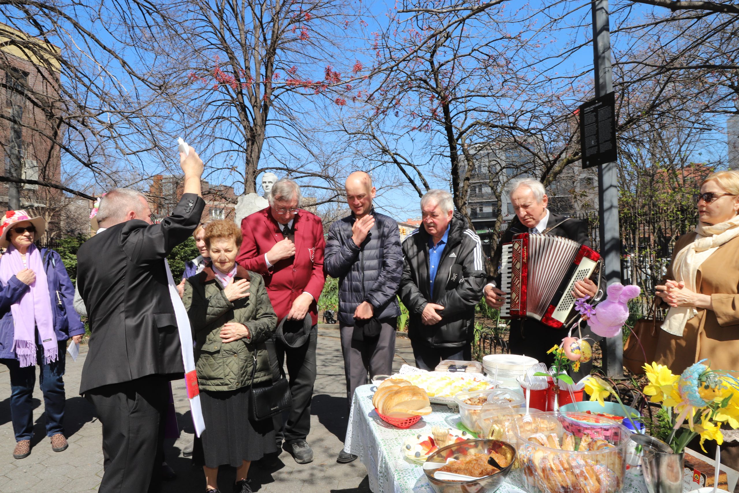 On the initiative of the seniors of the Krakus Club operating in the Polish Slavic Center, on Easter Sunday, March 31, the third meeting took place at the monument of Father Jerzy Popiełuszko in Greenpoint. Members of the Northside Senior Center from Williamsburg, friends and passers-by also attended. We were honored with the presence of: the president of the Polish Slavic Center, Marian Żak with his wife Małgorzata, the new president of the Polish-American Photography Club, Dariusz Kanarek, who came with his father, Krzysztof Kanarek, a former singer from Masovia and soloist of the Warsaw Operetta. Invited priest Grzegorz Markulak, parish priest of St. Stanisław Kostka in Greenpoint said: “After the end of the 40 days of Lent, we gather for the Feast of the Resurrection of the Lord. There is great joy in our hearts because Christ lives and is among us. Together with him, we are here in this community at the Easter table to share love, wish each other, and share the blessed egg, a sign of new life. Let us ask Christ, always present among those who love Him, to bless the food on our Easter table. After reciting the Litany of thanksgiving and prayers, he blessed the Easter food and those gathered.