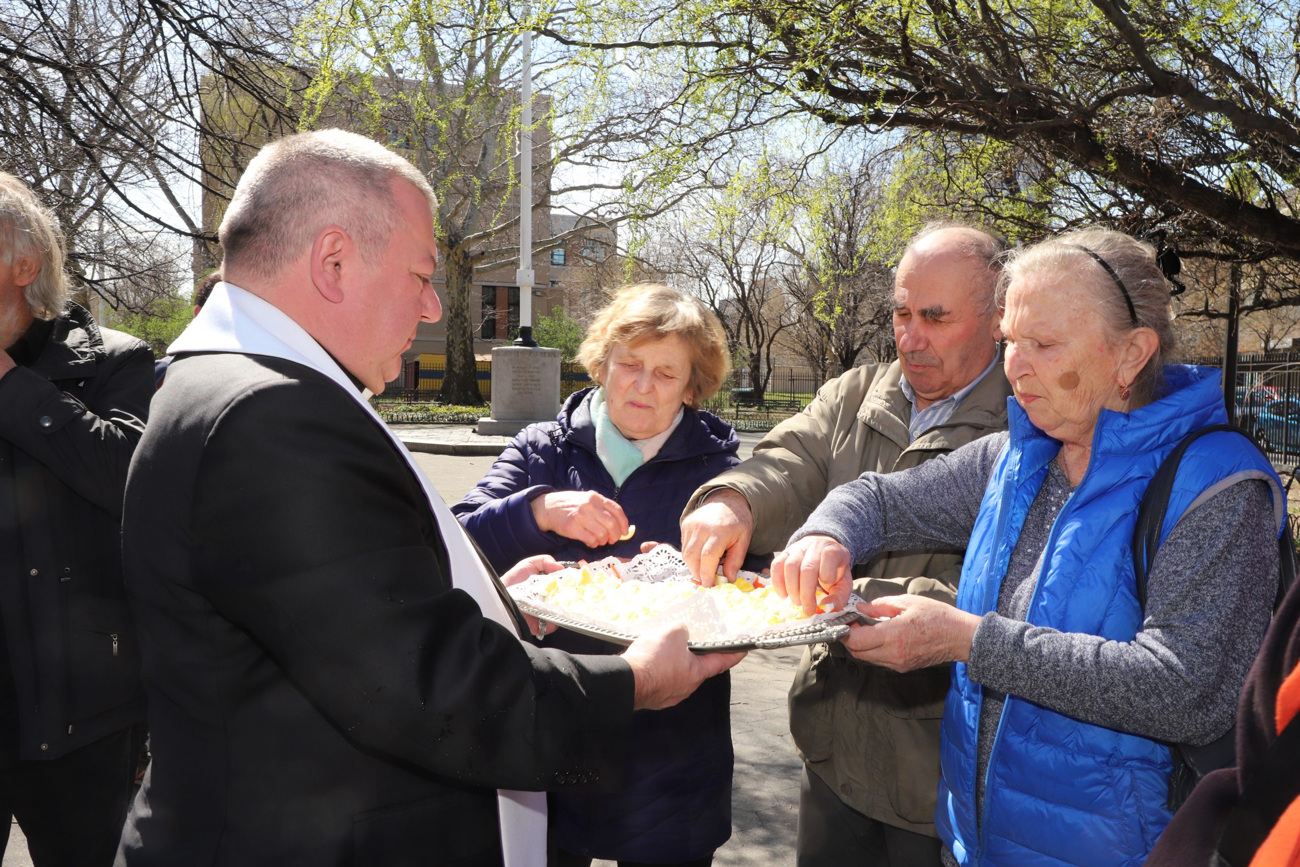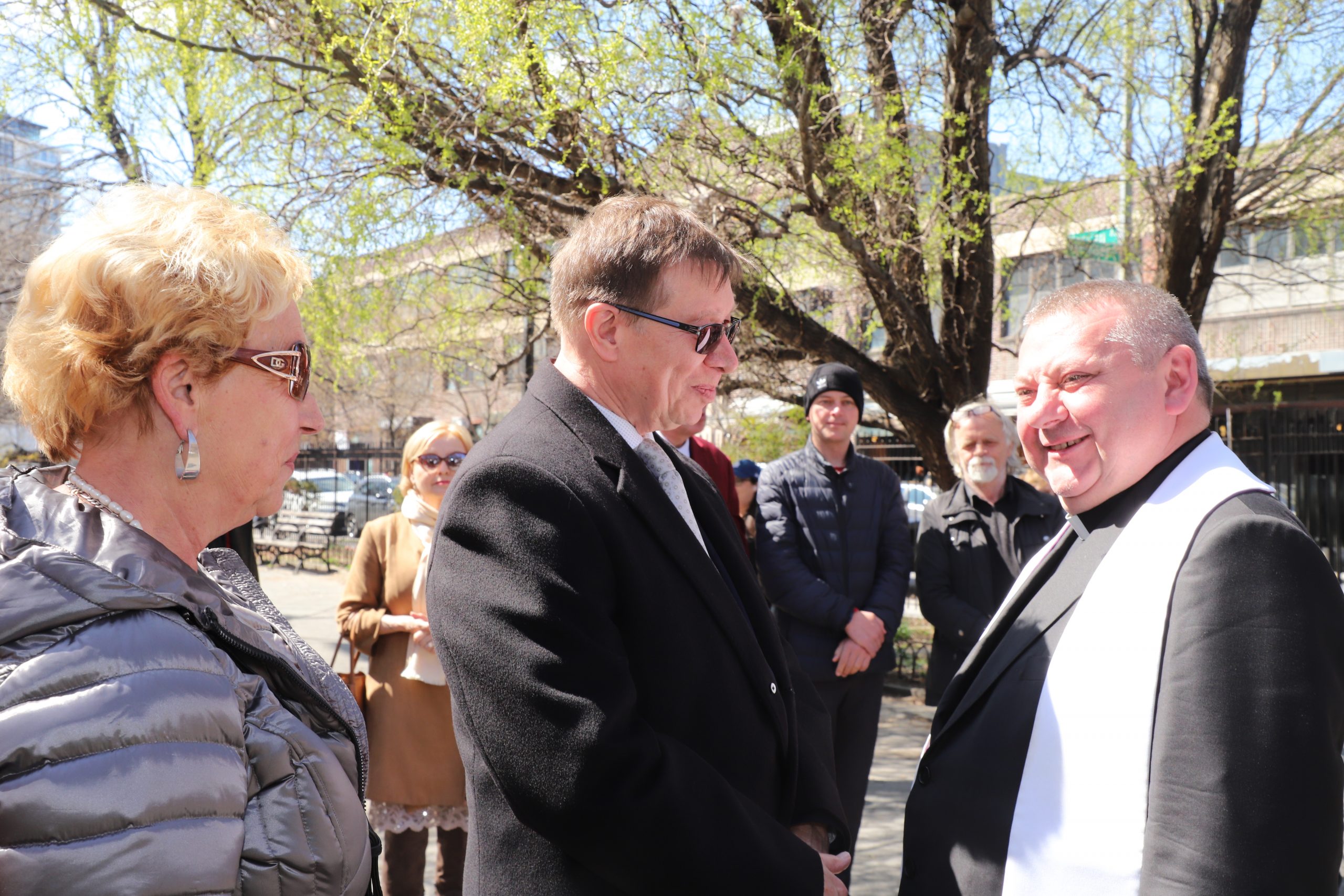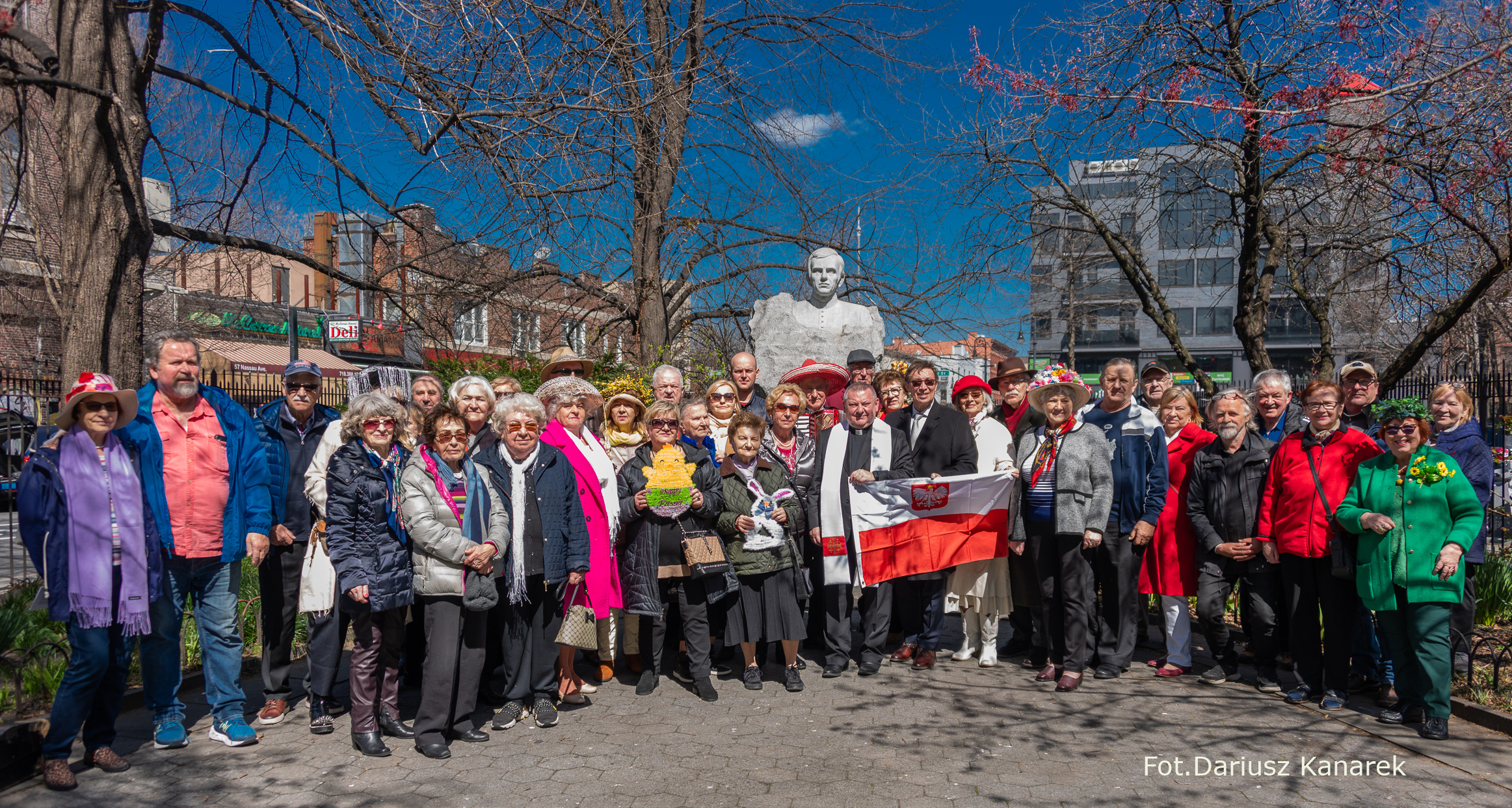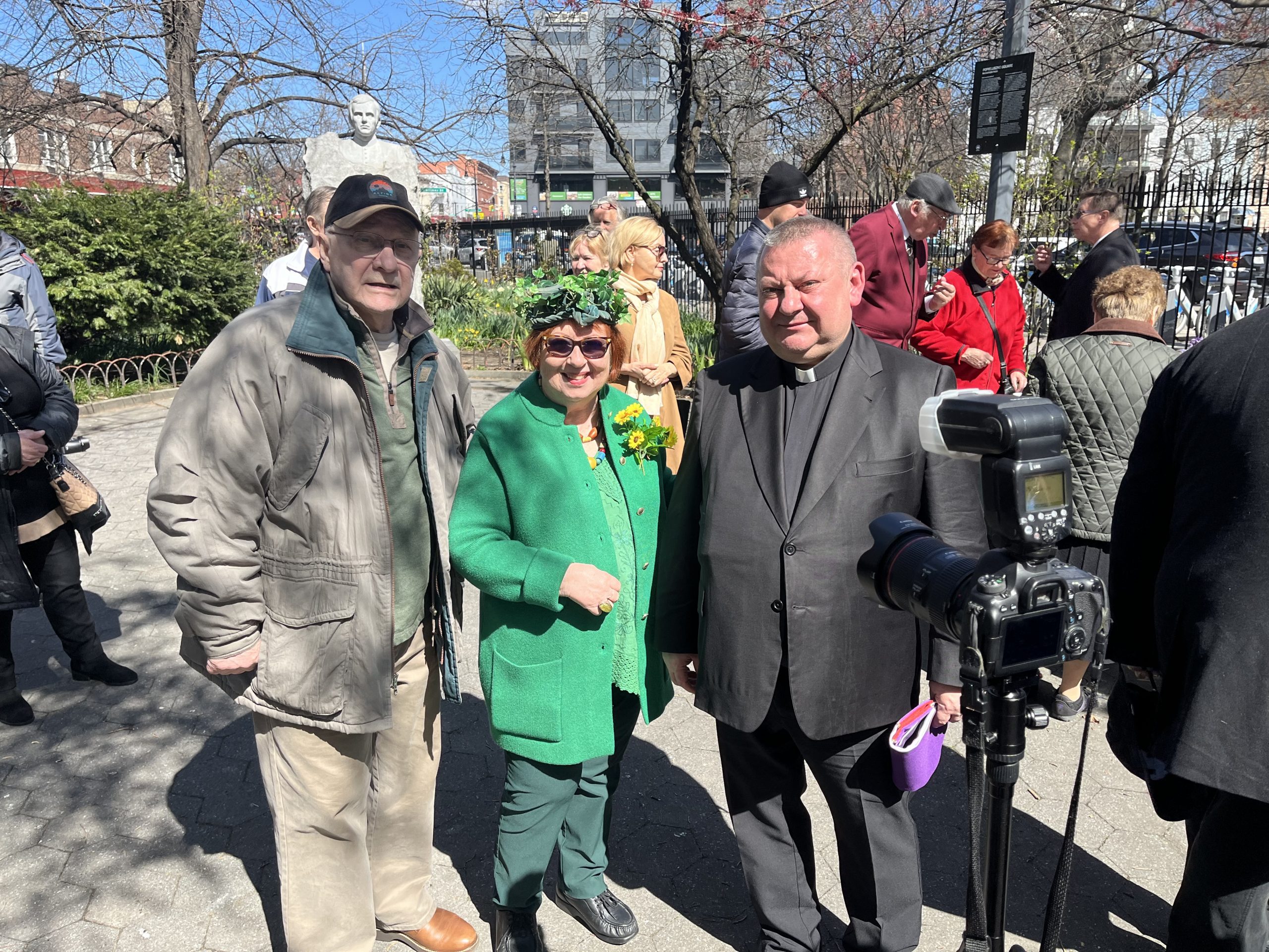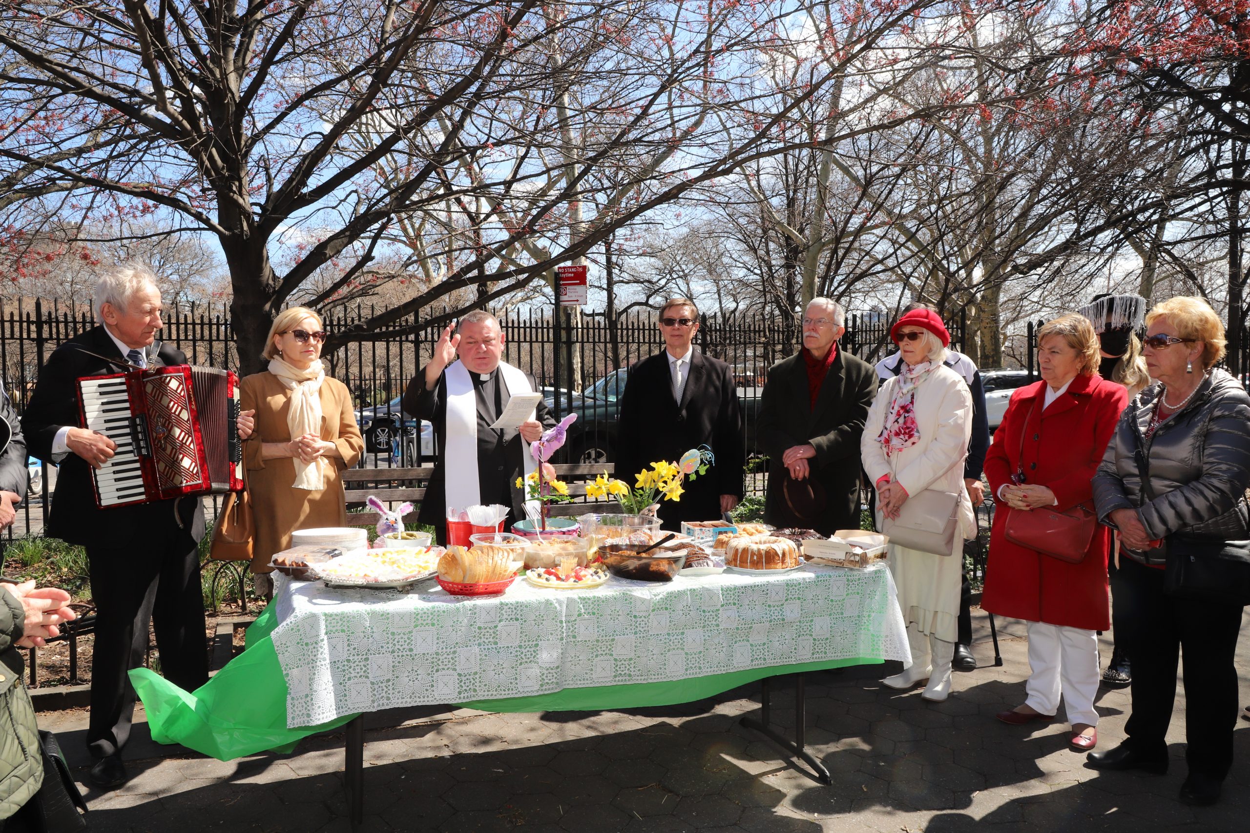On the initiative of the seniors of the Krakus Club operating in the Polish Slavic Center, on Easter Sunday, March 31, the third meeting took place at the monument of Father Jerzy Popiełuszko in Greenpoint. Members of the Northside Senior Center from Williamsburg, friends and passers-by also attended. We were honored with the presence of: the president of the Polish Slavic Center, Marian Żak with his wife Małgorzata, the new president of the Polish-American Photography Club, Dariusz Kanarek, who came with his father, Krzysztof Kanarek, a former singer from Masovia and soloist of the Warsaw Operetta. Invited priest Grzegorz Markulak, parish priest of St. Stanisław Kostka in Greenpoint said: “After the end of the 40 days of Lent, we gather for the Feast of the Resurrection of the Lord. There is great joy in our hearts because Christ lives and is among us. Together with him, we are here in this community at the Easter table to share love, wish each other, and share the blessed egg, a sign of new life. Let us ask Christ, always present among those who love Him, to bless the food on our Easter table. After reciting the Litany of thanksgiving and prayers, he blessed the Easter food and those gathered.