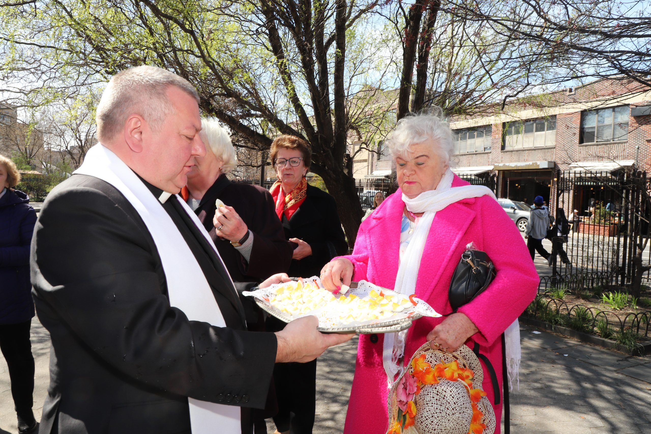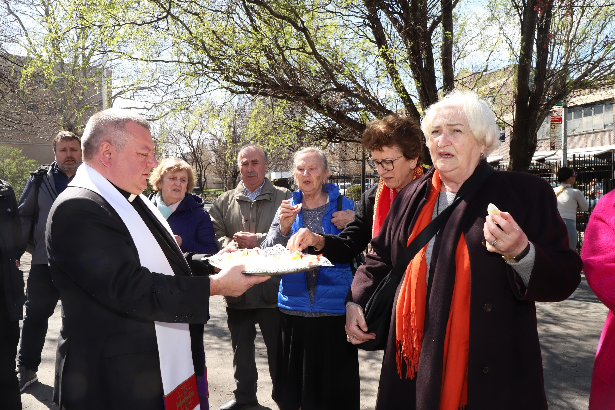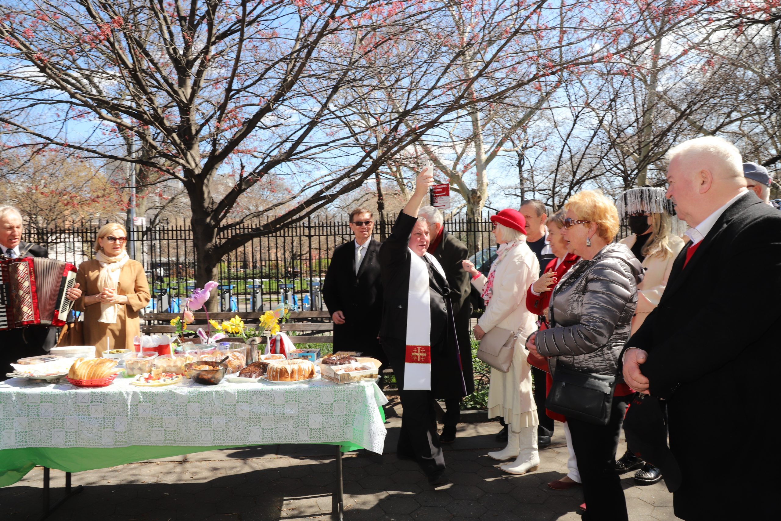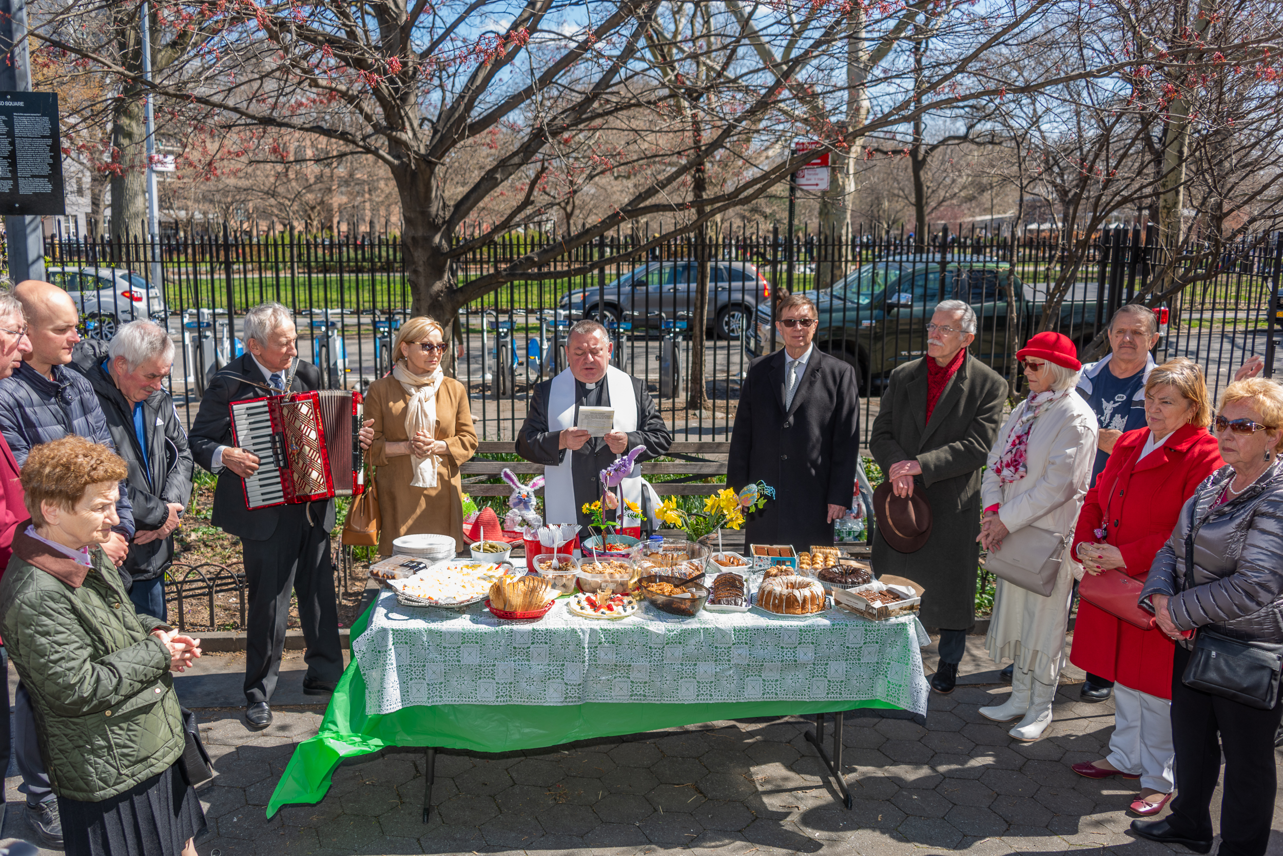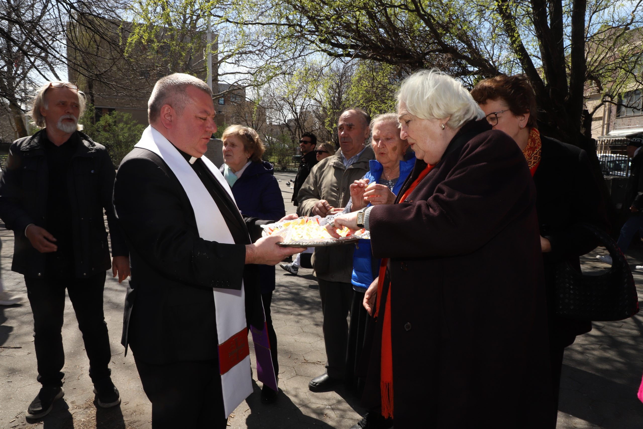 On the initiative of the seniors of the Krakus Club operating in the Polish Slavic Center, on Easter Sunday, March 31, the third meeting took place at the monument of Father Jerzy Popiełuszko in Greenpoint. Members of the Northside Senior Center from Williamsburg, friends and passers-by also attended. We were honored with the presence of: the president of the Polish Slavic Center, Marian Żak with his wife Małgorzata, the new president of the Polish-American Photography Club, Dariusz Kanarek, who came with his father, Krzysztof Kanarek, a former singer from Masovia and soloist of the Warsaw Operetta. Invited priest Grzegorz Markulak, parish priest of St. Stanisław Kostka in Greenpoint said: “After the end of the 40 days of Lent, we gather for the Feast of the Resurrection of the Lord. There is great joy in our hearts because Christ lives and is among us. Together with him, we are here in this community at the Easter table to share love, wish each other, and share the blessed egg, a sign of new life. Let us ask Christ, always present among those who love Him, to bless the food on our Easter table. After reciting the Litany of thanksgiving and prayers, he blessed the Easter food and those gathered.