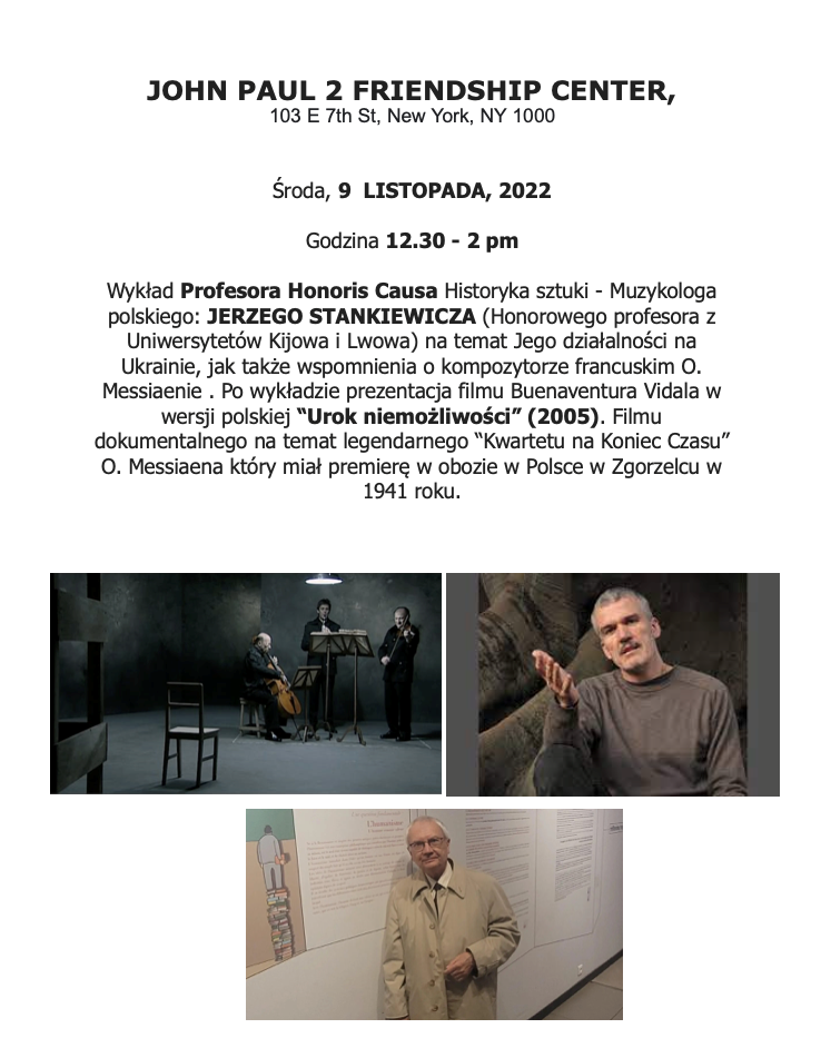 November 9, 2022 John Paul II Friendship Center hosted a lecture by honorary Professor Jerzy Stankiewicz. The lecture was an introduction to the screening of a movie “Charm of Impossibilities” by Beuneventura Vidal (2005). It was a premiere of the movie with Polish subtitles done by professor Stankiewicz and a second New York screening following last year’s presentation at Carnegie Hall.