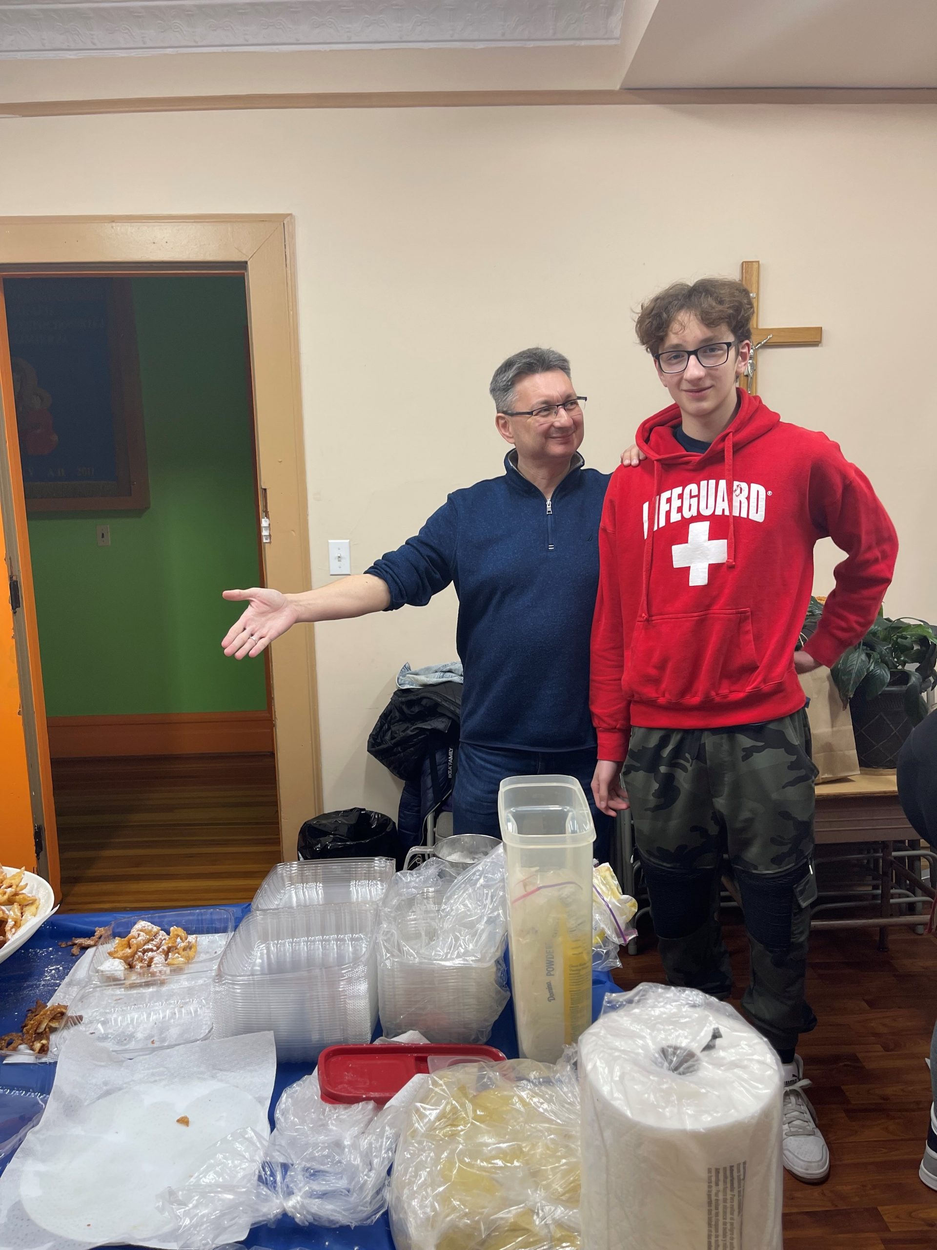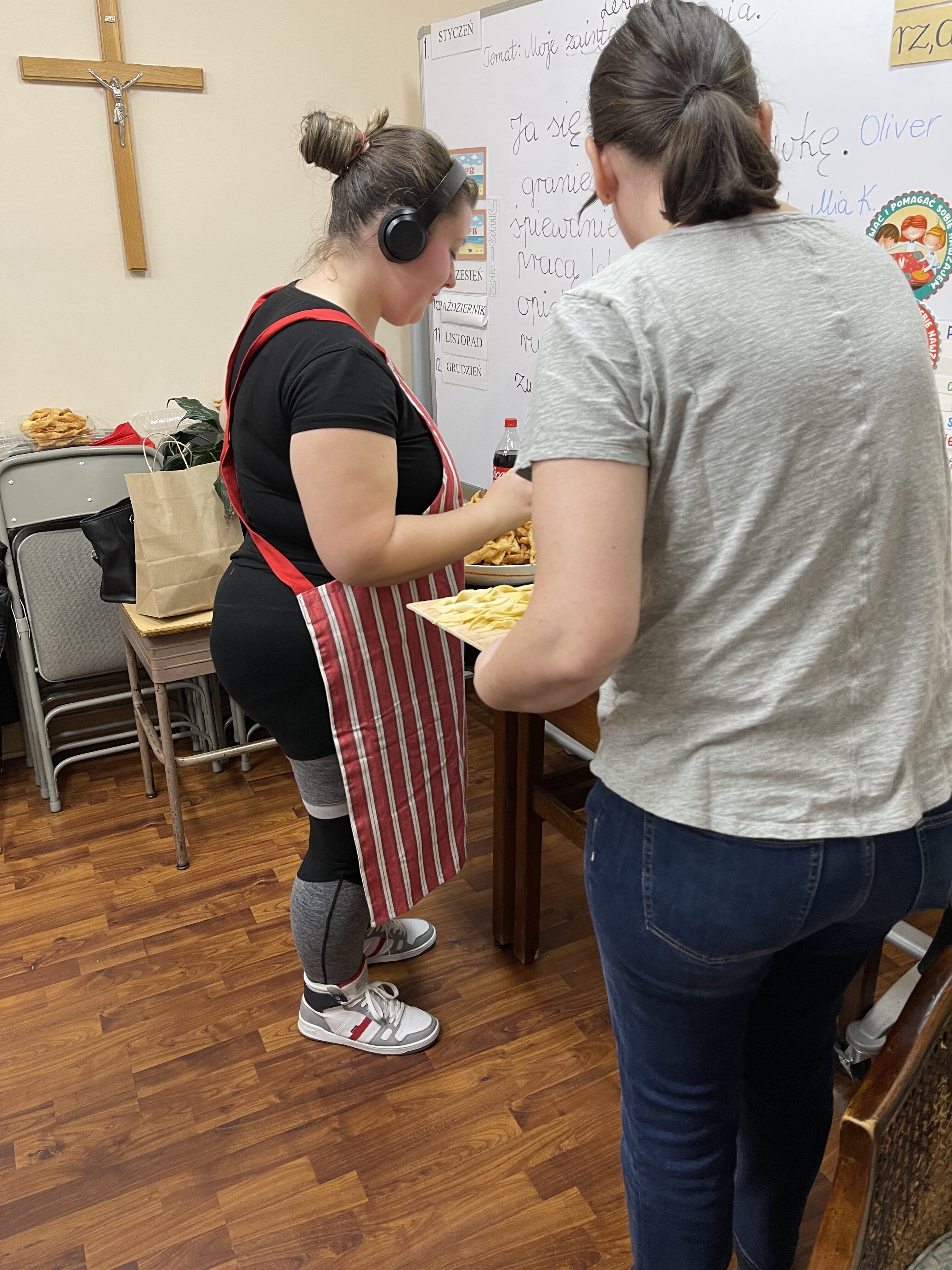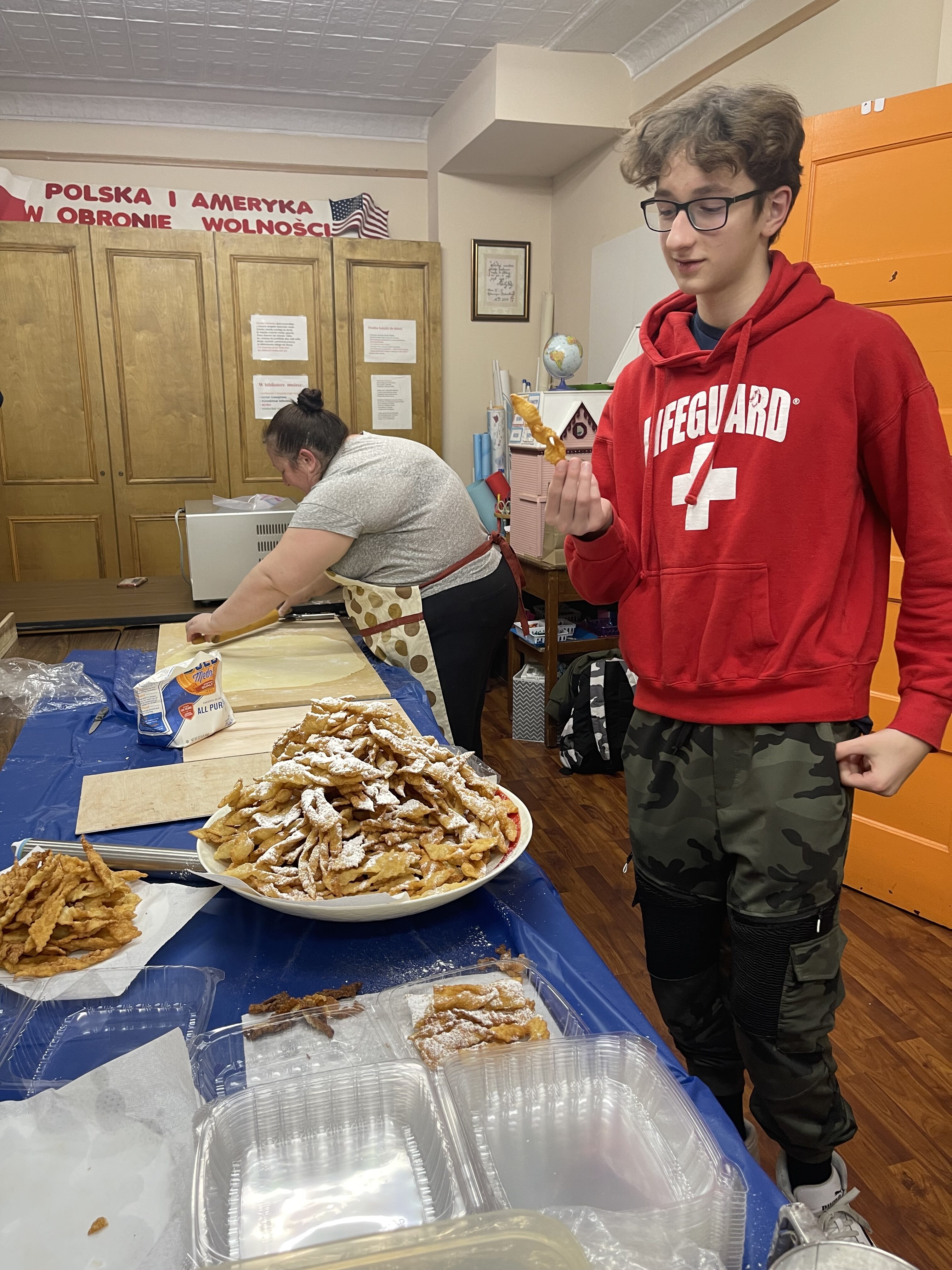 The school principal Małgorzata Czajkowski and teacher Wojciech Krzyształowicz played the role of confectionery masters. While the dough was resting, they conducted a passionate culinary lesson for 45 minutes. The oil temperature was converted from Celsius to Fahrenheit and it was found that the higher the number next to the flour name, the thicker and denser it is and requires more effort when kneading the dough, and the consistency of the dough and the oil temperature have a decisive influence on making the Chruścik crispy and tasty.