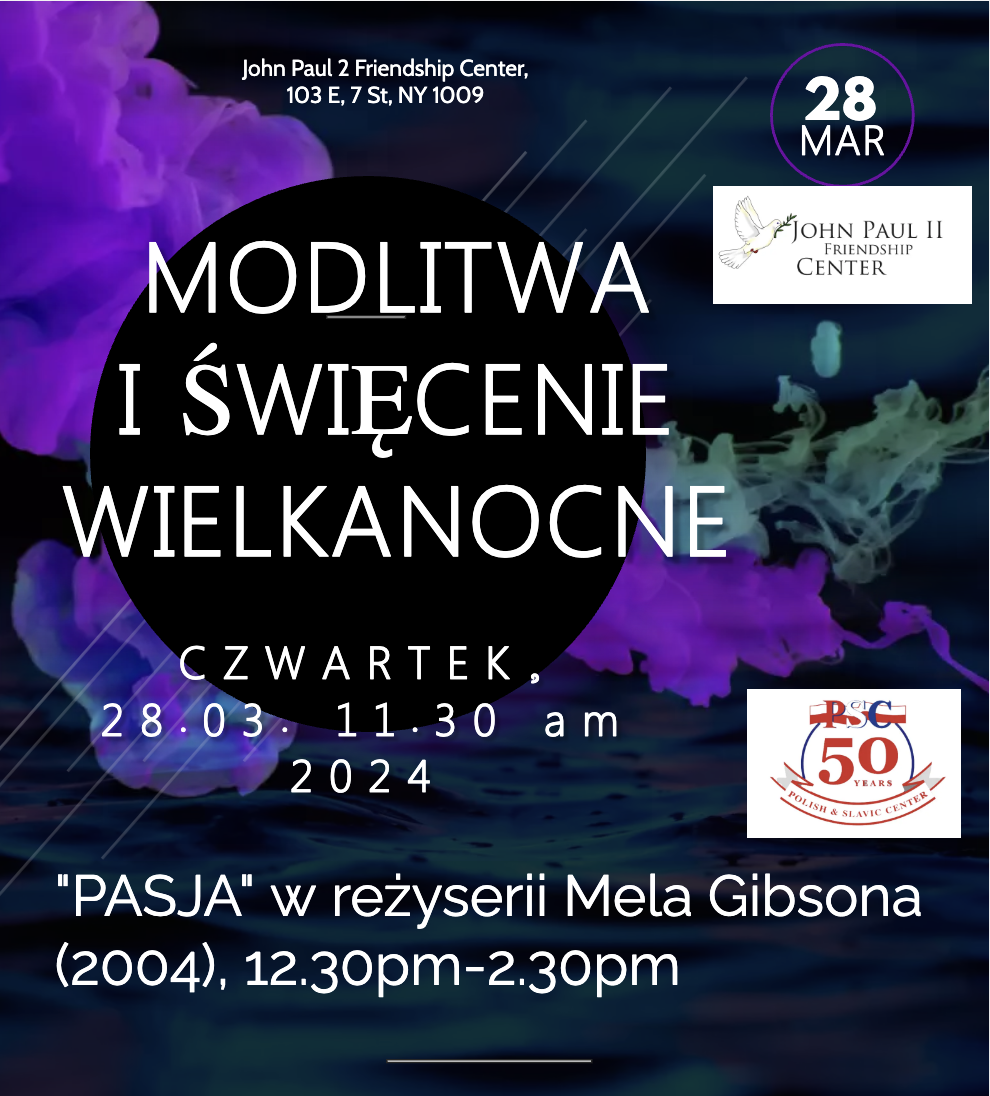 March 28 on Thursday at the Polish Slavic Center – JP2 Friendship Center in Manhattan, the will be an Easter Holiday Celebration and movie “Passion” by Mel Gibson presented. Welcome Everoyne.