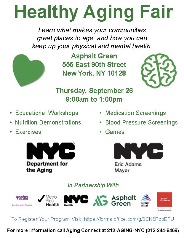 Mayor Eric Adams and NYC Aging are inviting your members to a Healthy Aging Fair on Thursday, September 26th from 9am-1pm. The Fair, which will be held at Asphalt Green, 555 East 90th Street in Manhattan, will offer a day of health screenings, demonstrations and workshops designed to help older New Yorkers maintain their physical and mental health.