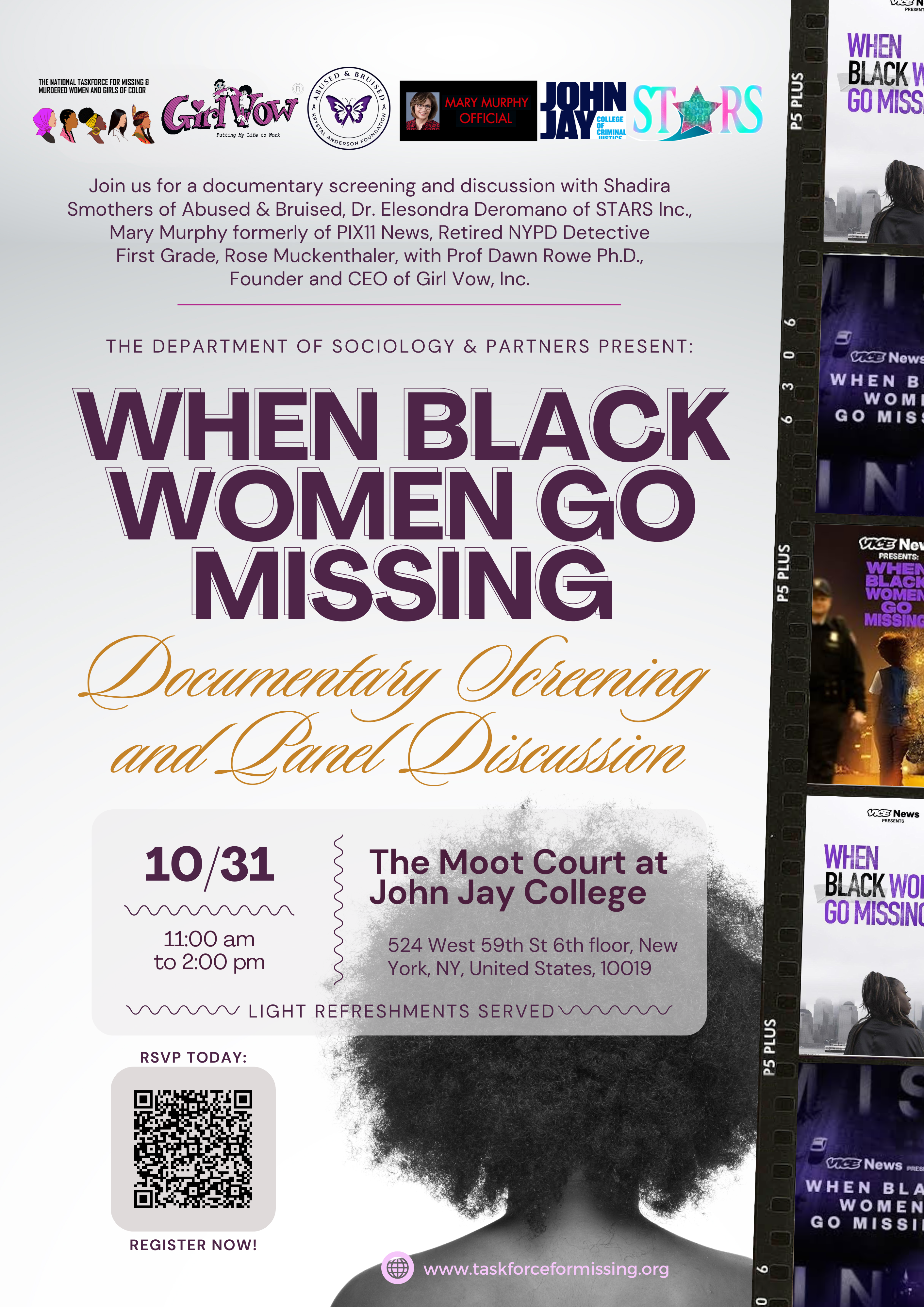 On behalf of Girl Vow & John Jay College of Criminal Justice – Department of Sociology, you are cordially invited to our upcoming events on missing and murdered women on October 31st and November 1st, 2024.