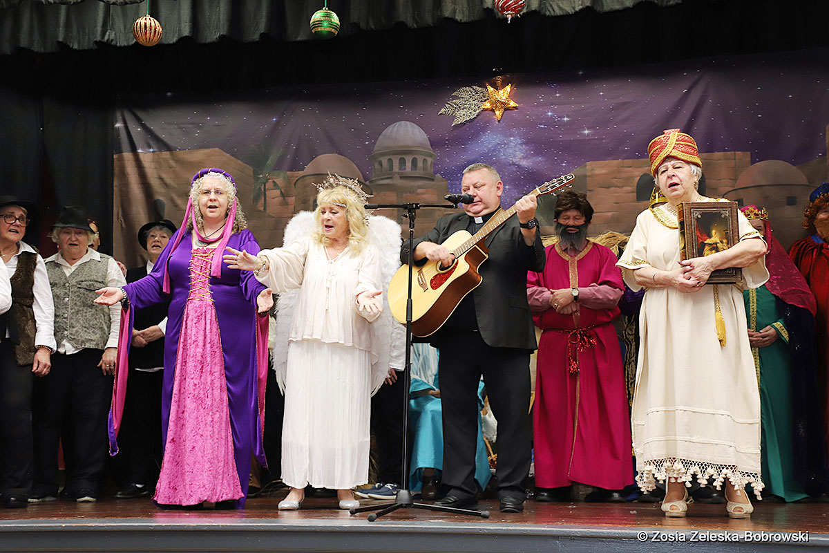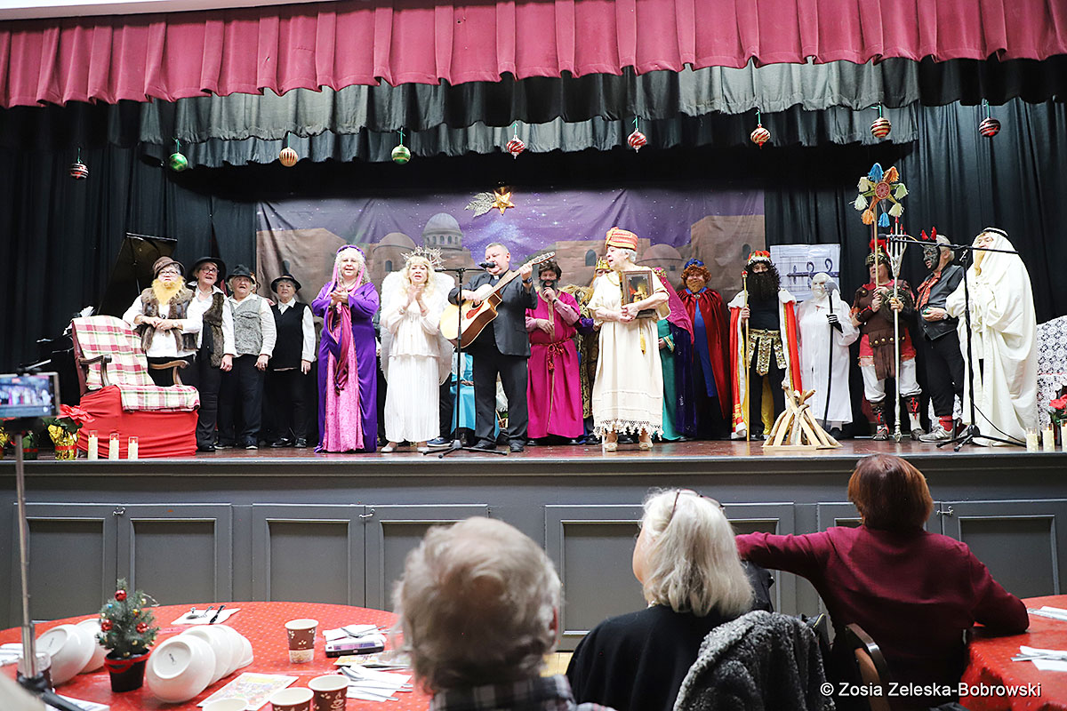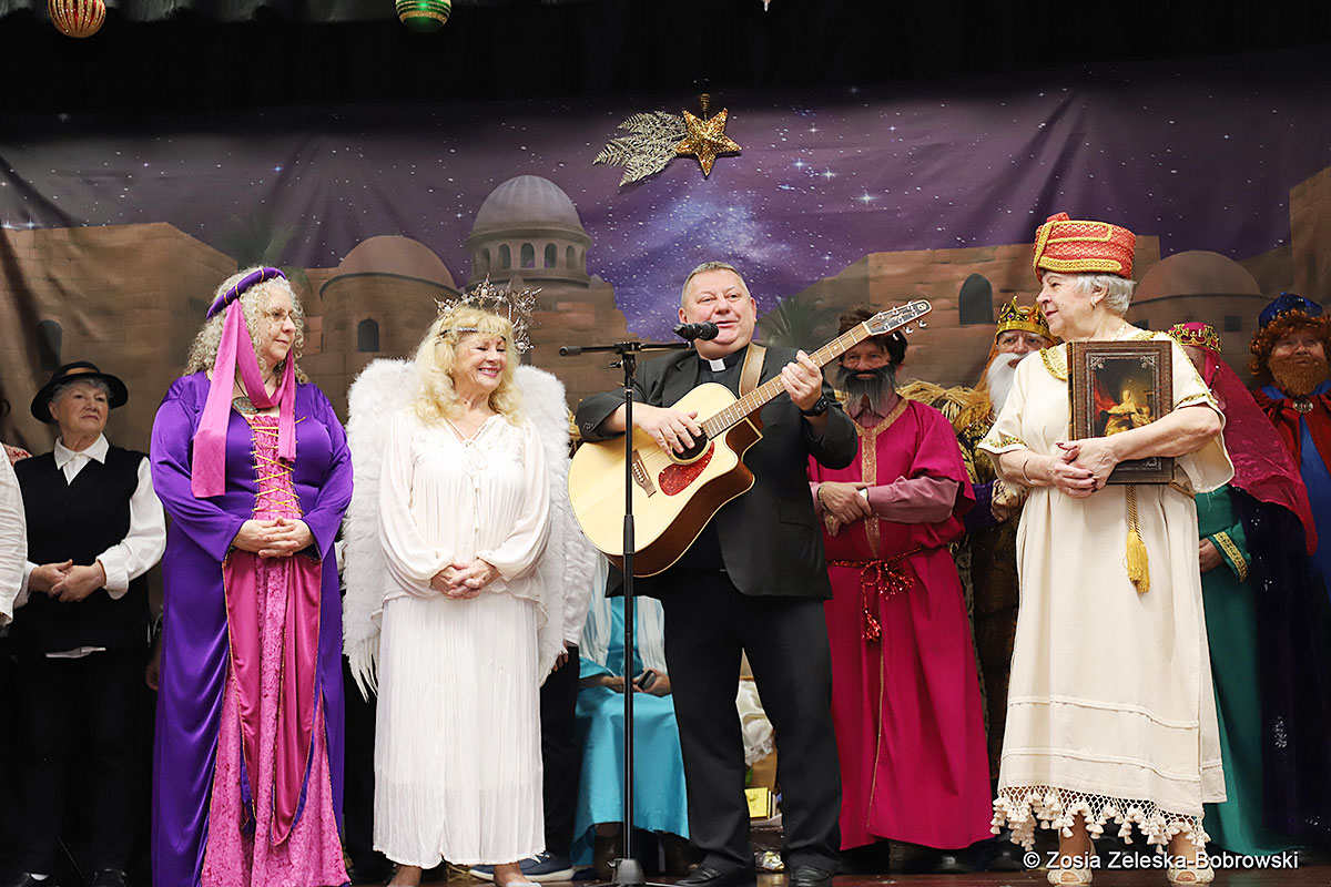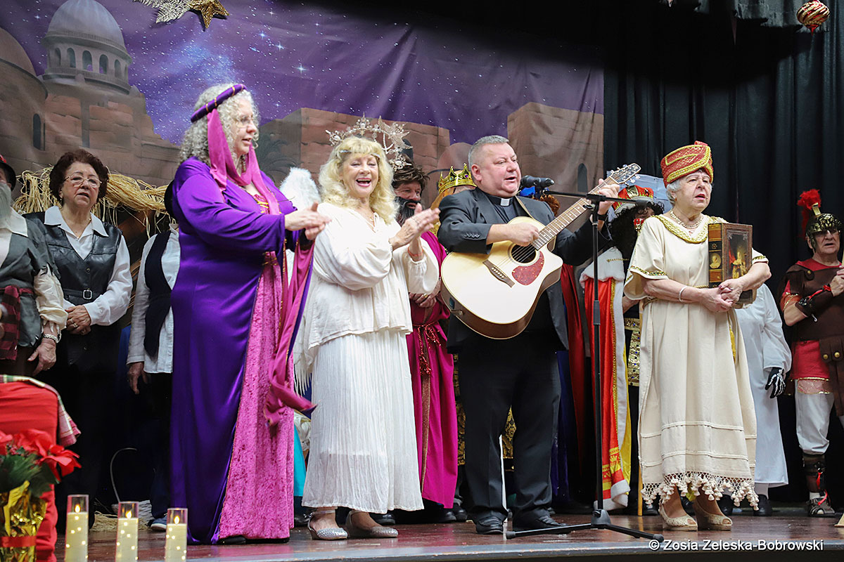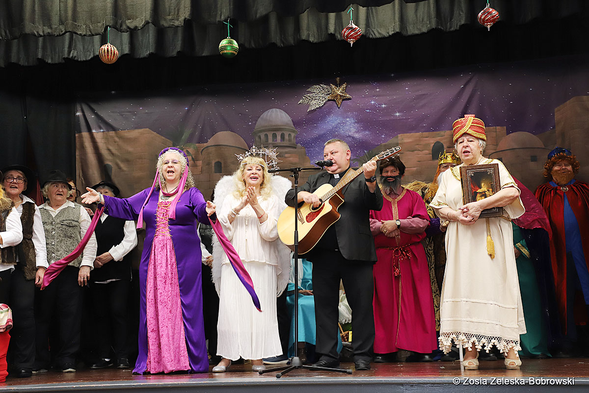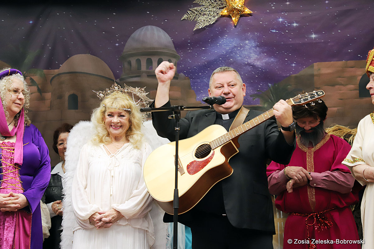 However, the “Nativity play” was not the end of the carol singing at the “Krakus” Senior Center. The president of the Polish and Slavic Center, Pawel Pachacz, unexpectedly appeared on the stage and played three carols on the trumpet so beautifully that all the choir members joined him. If anyone thinks that this is the end of surprises, they are very wrong. Another unexpected guest and envoy with the message of the birth of the Lord on the stage was parish priest Grzegorz Markulak, who played the guitar and sang more carols. And the true Magic of Polish Christmas reigned, and everyone on the stage and the audience united into one big family, which praised the birth of Jesus in the manger.