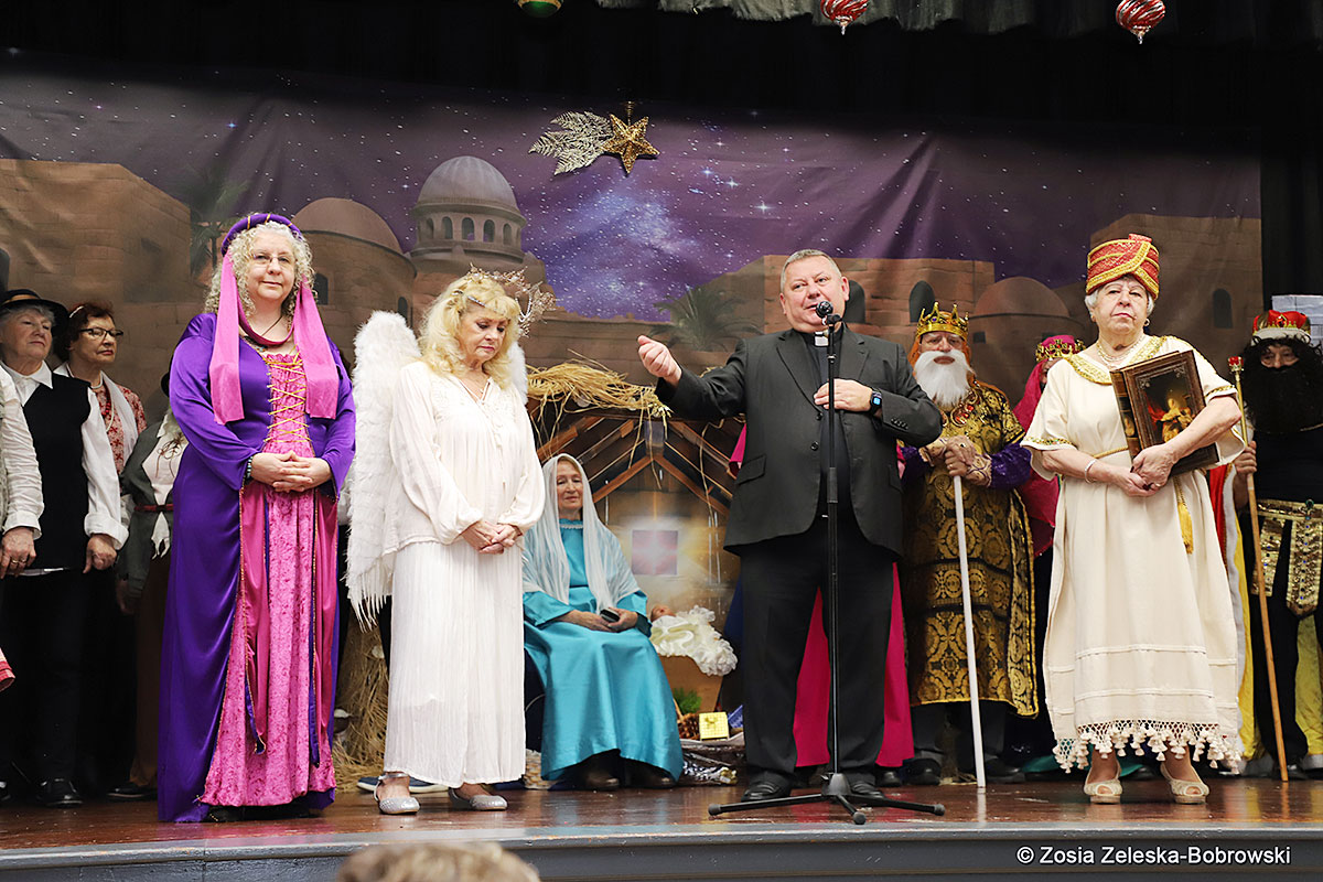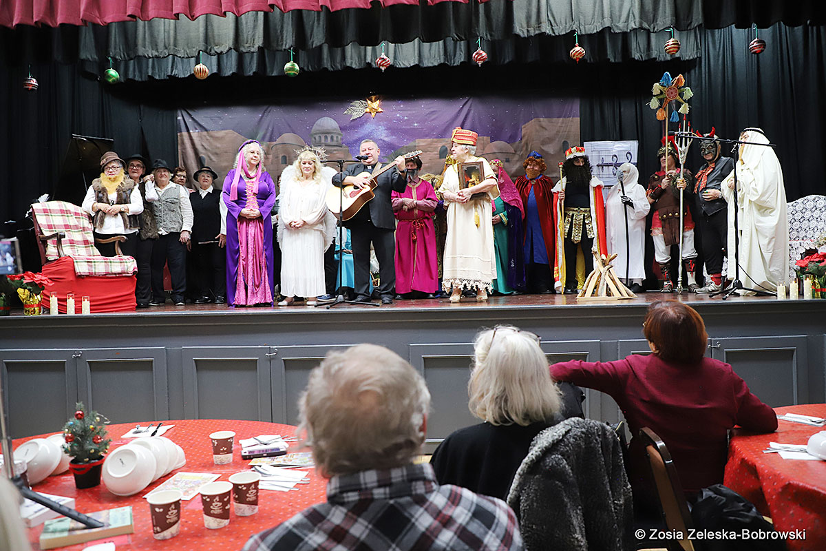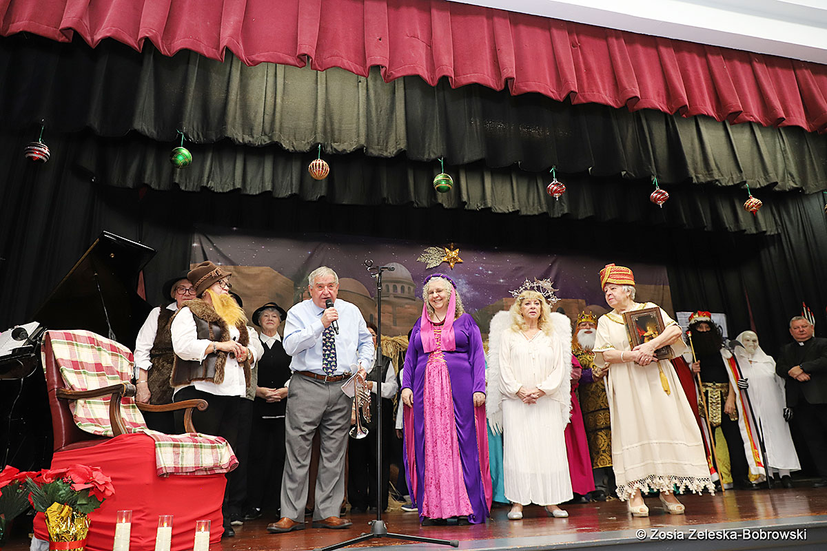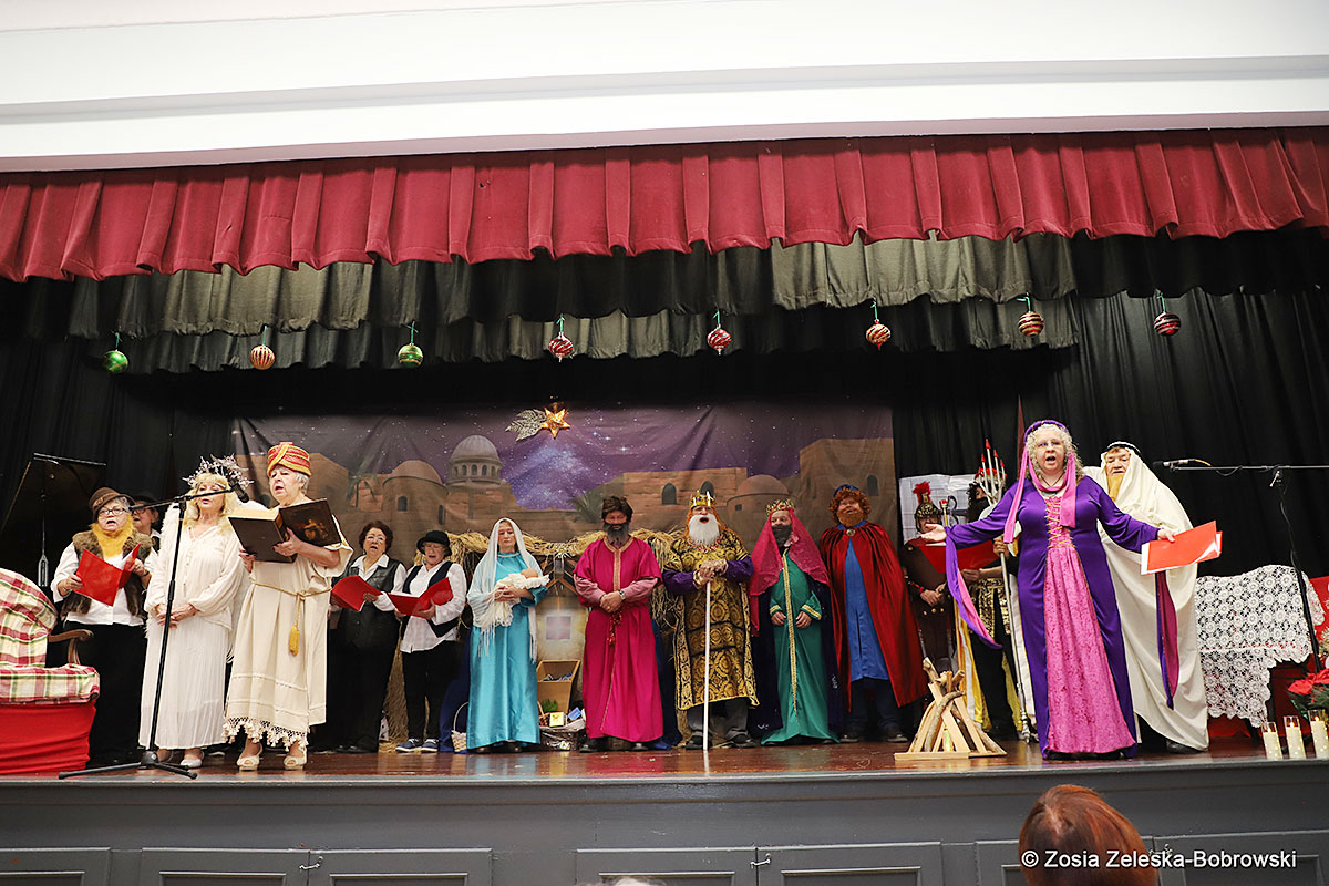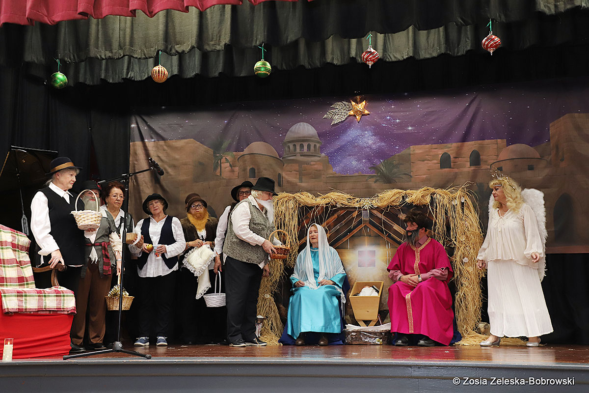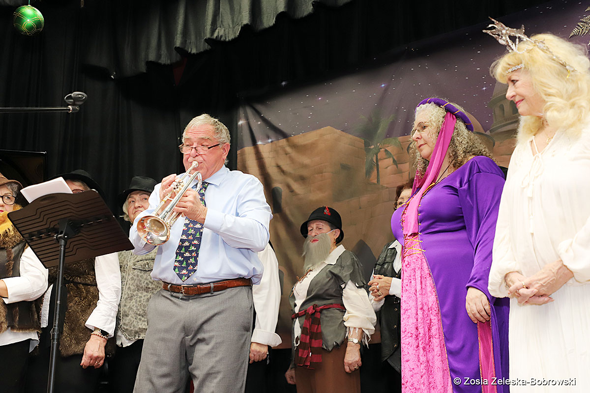 However, the “Nativity play” was not the end of the carol singing at the “Krakus” Senior Center. The president of the Polish and Slavic Center, Pawel Pachacz, unexpectedly appeared on the stage and played three carols on the trumpet so beautifully that all the choir members joined him. If anyone thinks that this is the end of surprises, they are very wrong. Another unexpected guest and envoy with the message of the birth of the Lord on the stage was parish priest Grzegorz Markulak, who played the guitar and sang more carols. And the true Magic of Polish Christmas reigned, and everyone on the stage and the audience united into one big family, which praised the birth of Jesus in the manger.