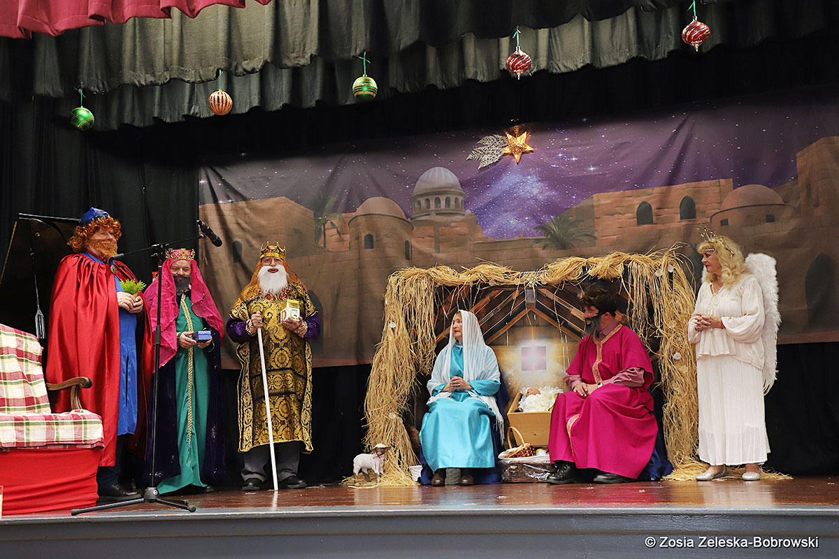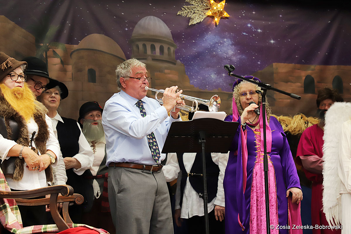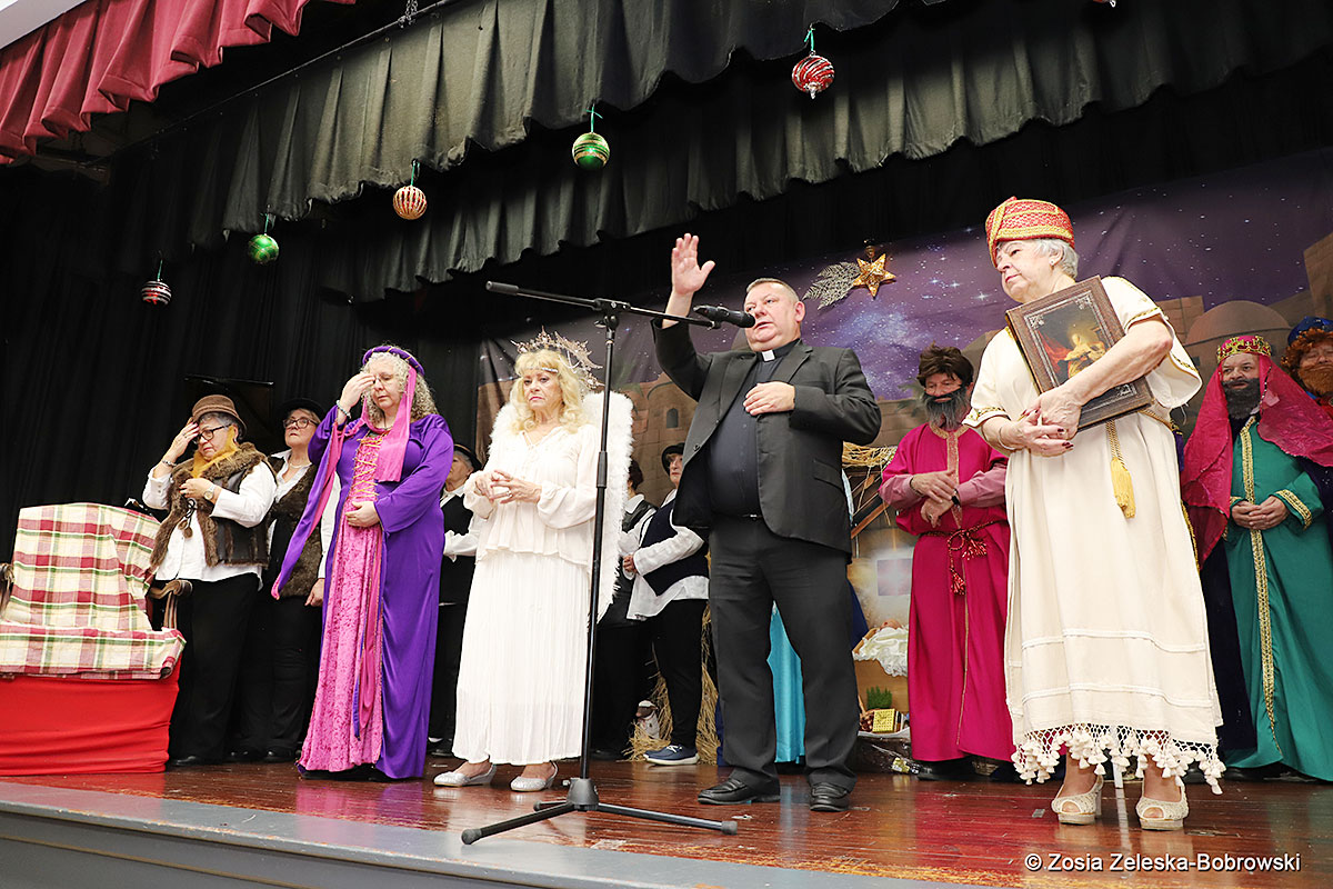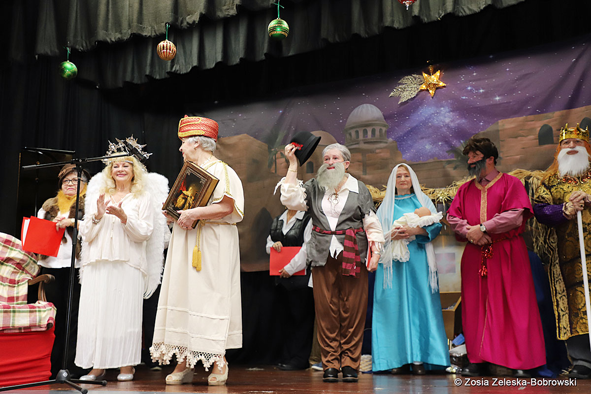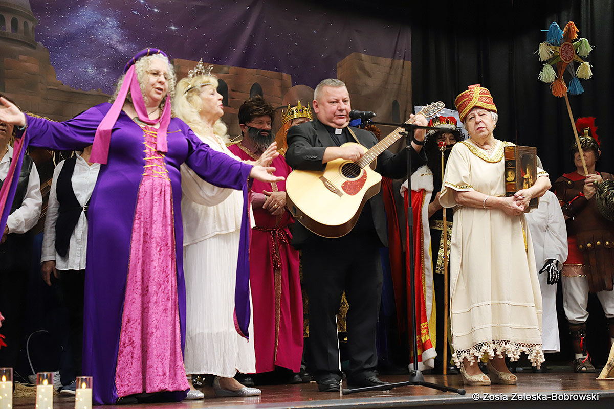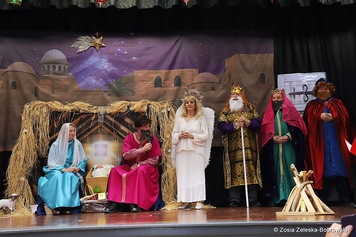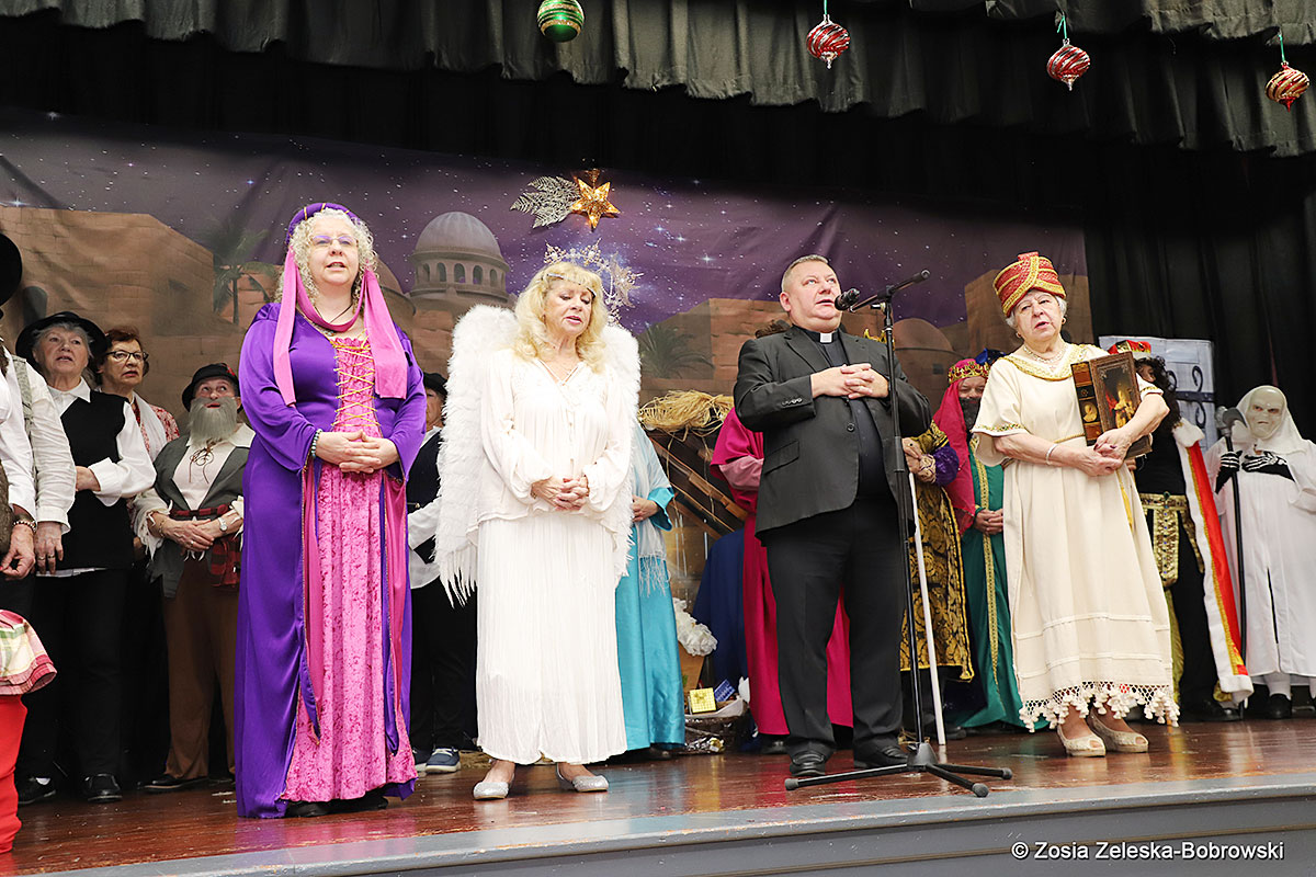 However, the “Nativity play” was not the end of the carol singing at the “Krakus” Senior Center. The president of the Polish and Slavic Center, Pawel Pachacz, unexpectedly appeared on the stage and played three carols on the trumpet so beautifully that all the choir members joined him. If anyone thinks that this is the end of surprises, they are very wrong. Another unexpected guest and envoy with the message of the birth of the Lord on the stage was parish priest Grzegorz Markulak, who played the guitar and sang more carols. And the true Magic of Polish Christmas reigned, and everyone on the stage and the audience united into one big family, which praised the birth of Jesus in the manger.