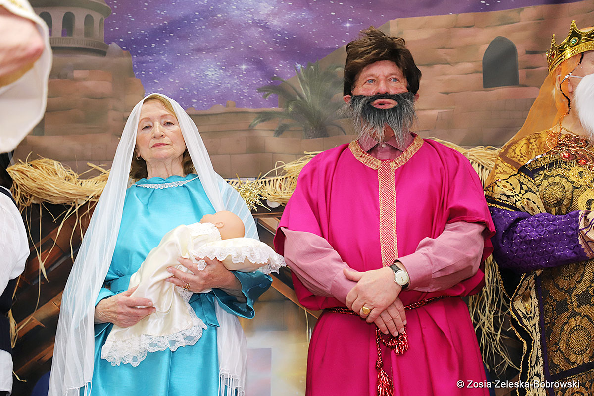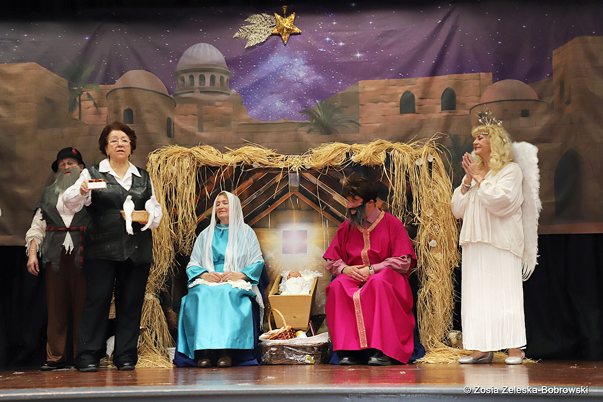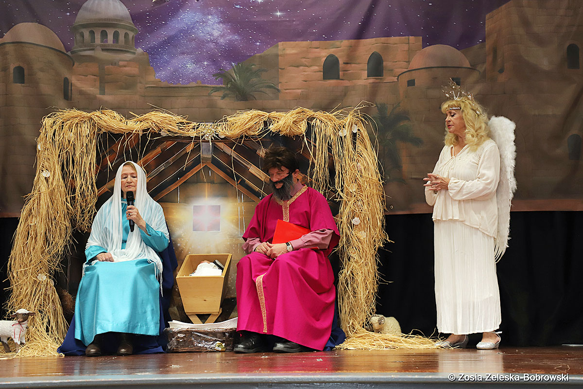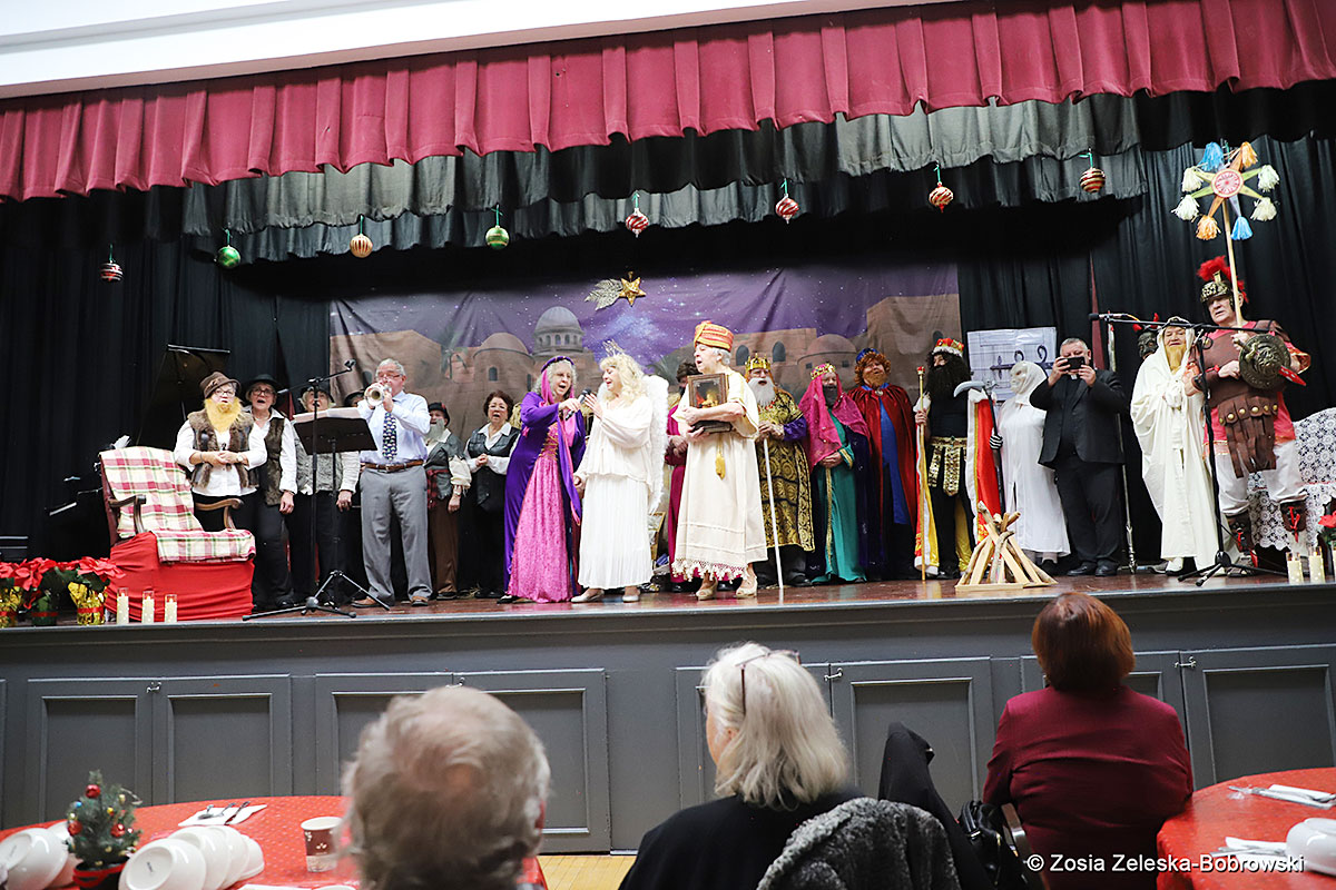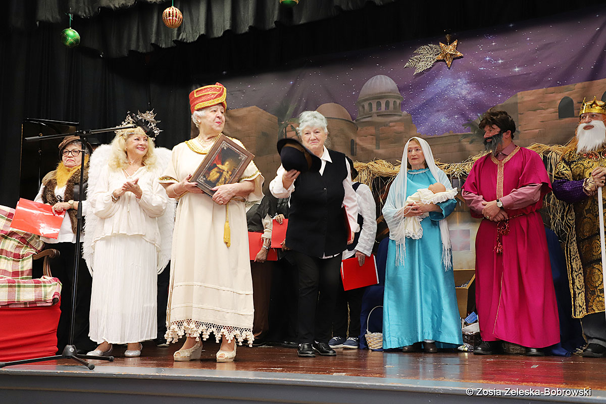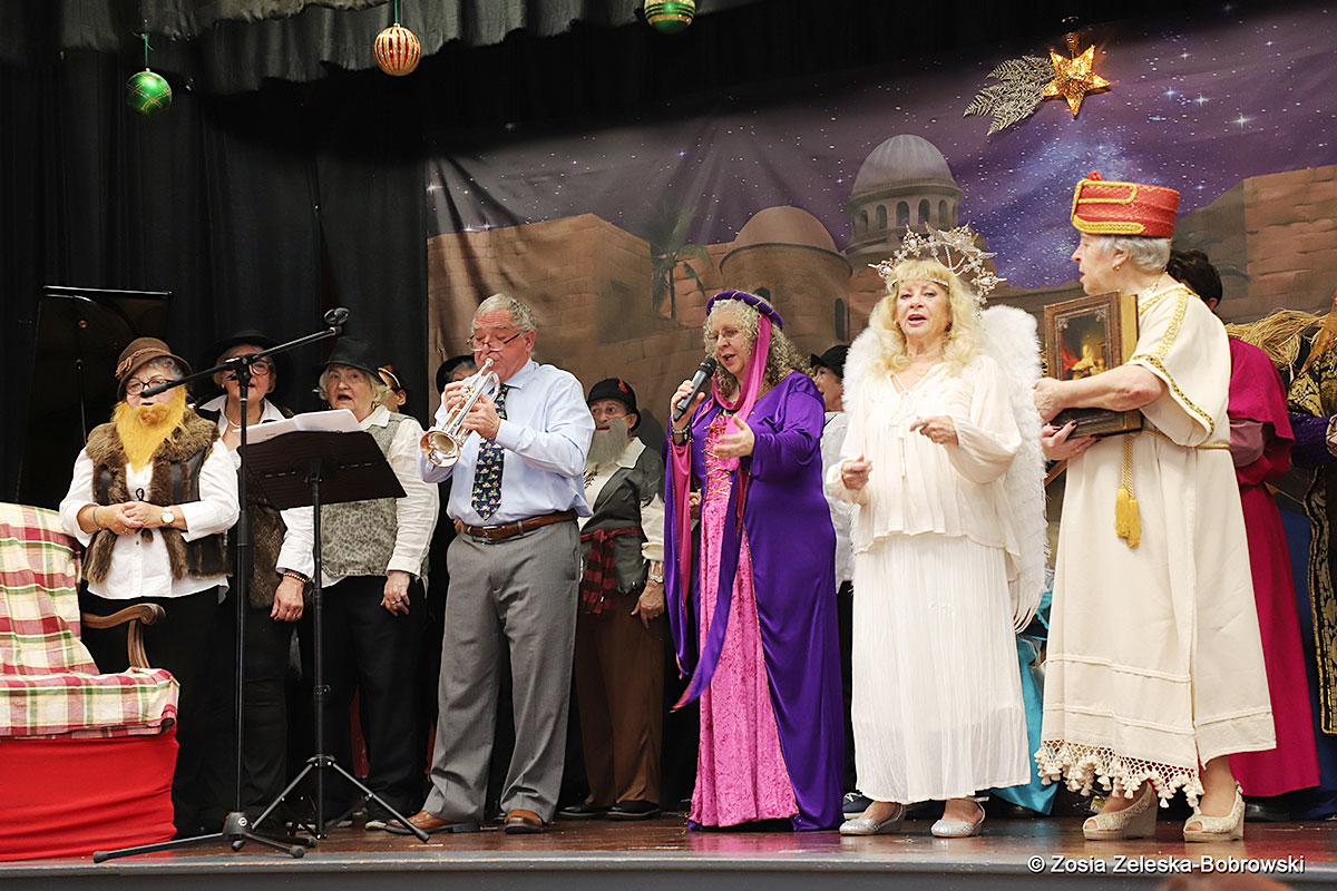 However, the “Nativity play” was not the end of the carol singing at the “Krakus” Senior Center. The president of the Polish and Slavic Center, Pawel Pachacz, unexpectedly appeared on the stage and played three carols on the trumpet so beautifully that all the choir members joined him. If anyone thinks that this is the end of surprises, they are very wrong. Another unexpected guest and envoy with the message of the birth of the Lord on the stage was parish priest Grzegorz Markulak, who played the guitar and sang more carols. And the true Magic of Polish Christmas reigned, and everyone on the stage and the audience united into one big family, which praised the birth of Jesus in the manger.