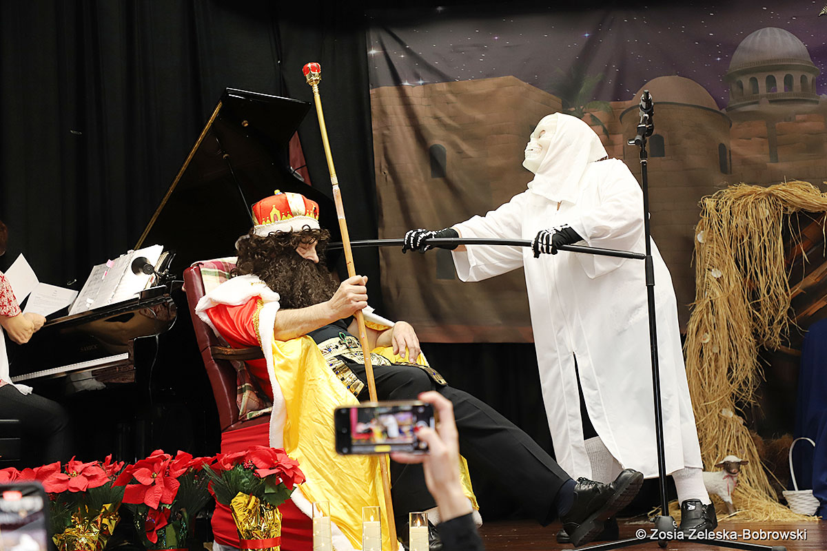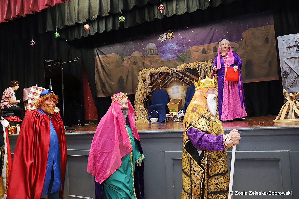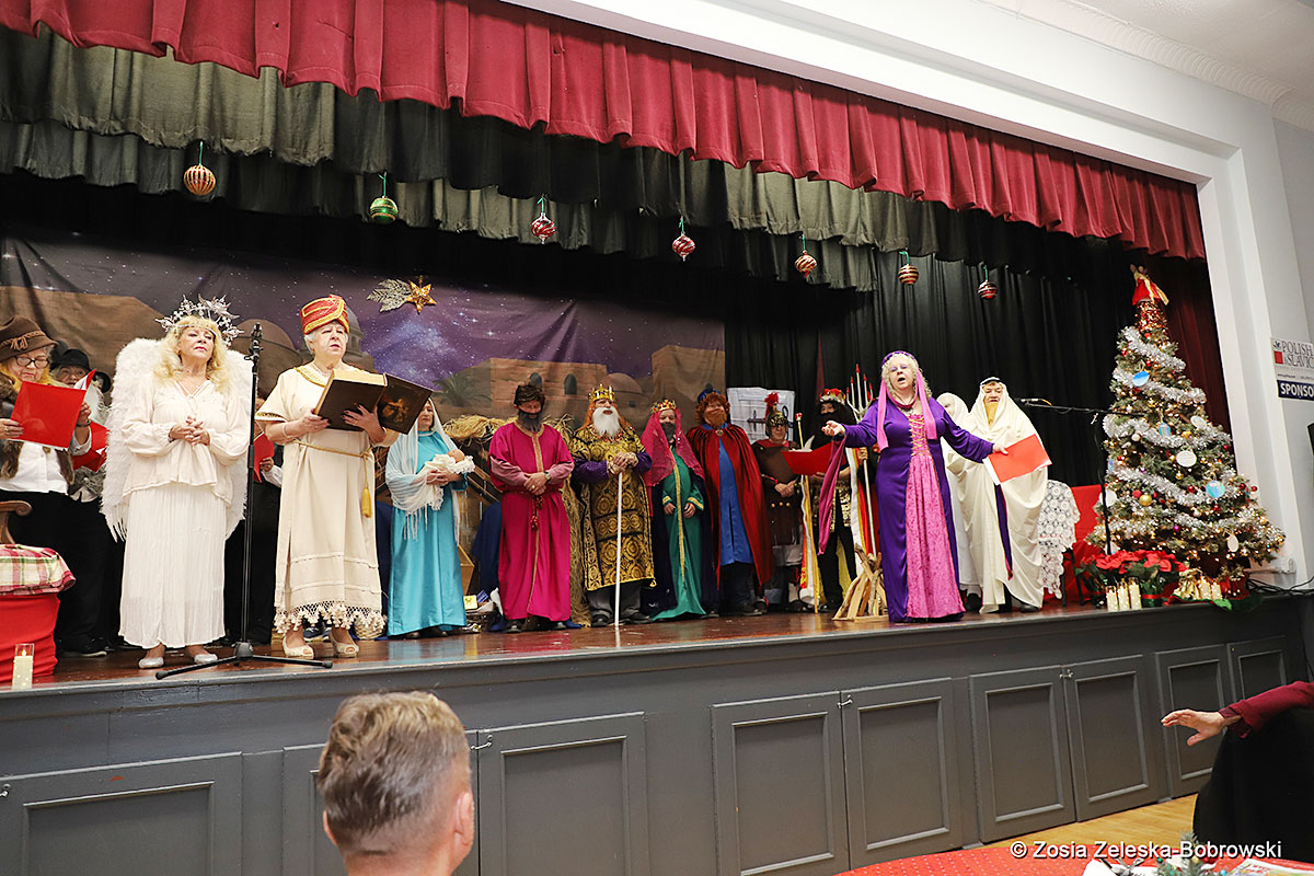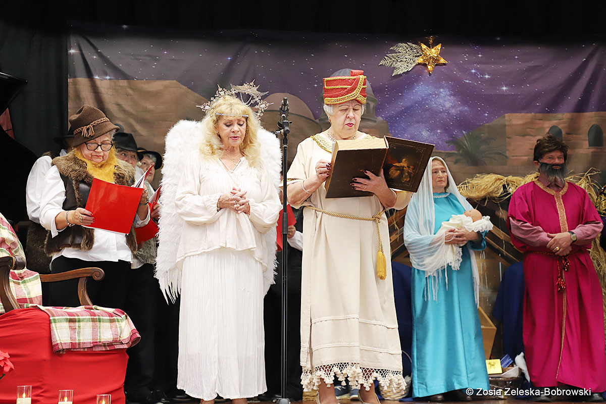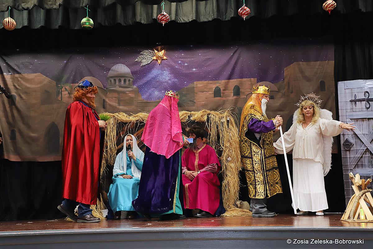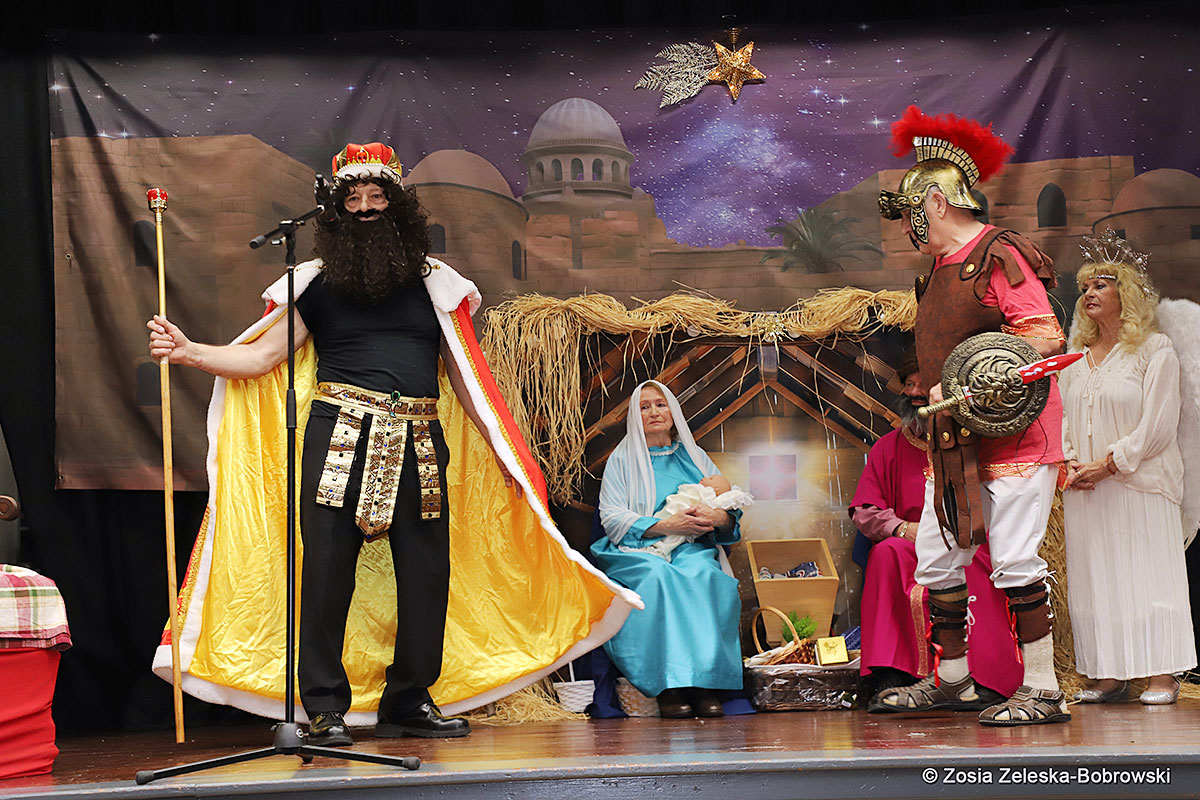 However, the “Nativity play” was not the end of the carol singing at the “Krakus” Senior Center. The president of the Polish and Slavic Center, Pawel Pachacz, unexpectedly appeared on the stage and played three carols on the trumpet so beautifully that all the choir members joined him. If anyone thinks that this is the end of surprises, they are very wrong. Another unexpected guest and envoy with the message of the birth of the Lord on the stage was parish priest Grzegorz Markulak, who played the guitar and sang more carols. And the true Magic of Polish Christmas reigned, and everyone on the stage and the audience united into one big family, which praised the birth of Jesus in the manger.