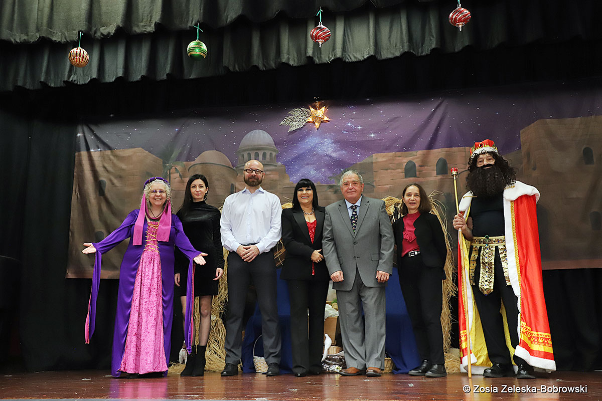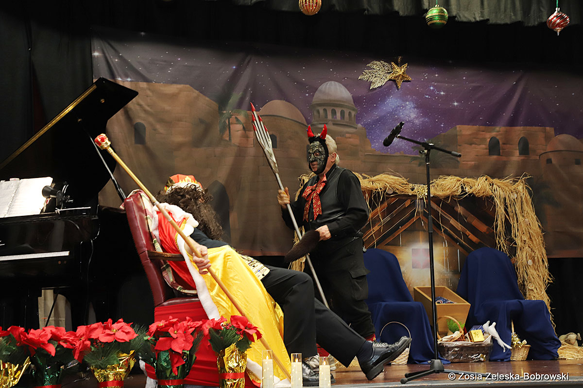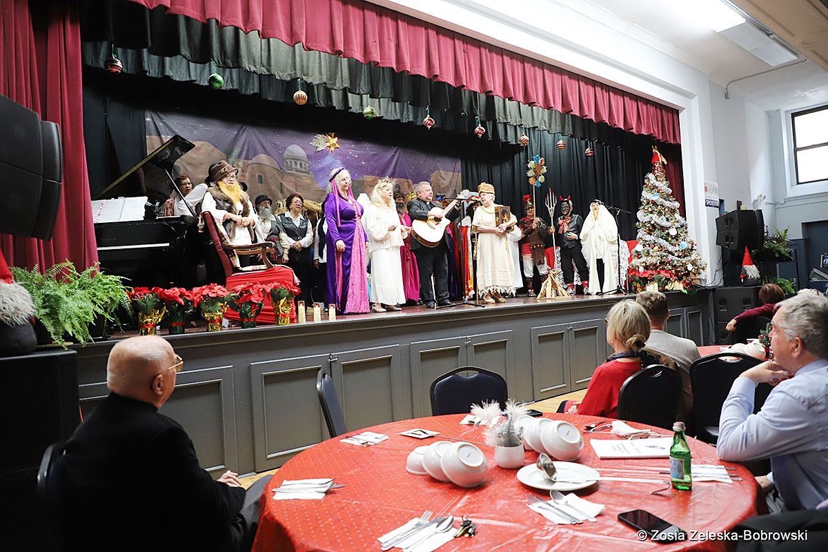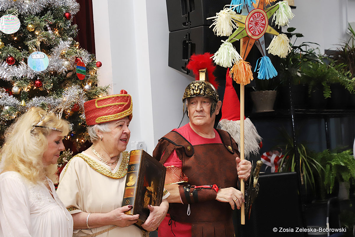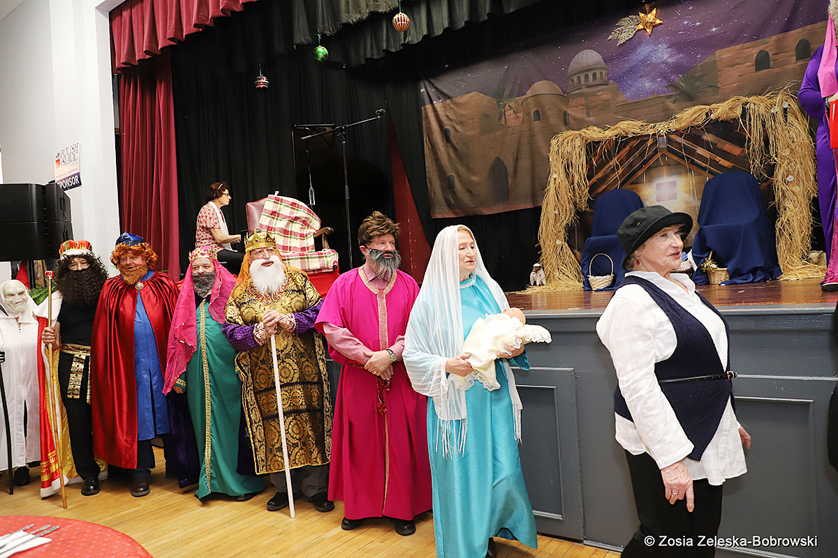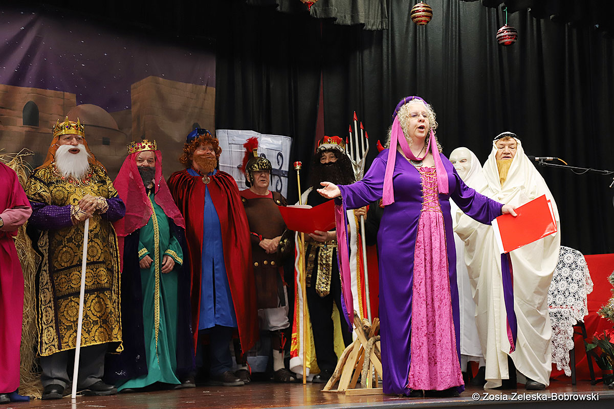 However, the “Nativity play” was not the end of the carol singing at the “Krakus” Senior Center. The president of the Polish and Slavic Center, Pawel Pachacz, unexpectedly appeared on the stage and played three carols on the trumpet so beautifully that all the choir members joined him. If anyone thinks that this is the end of surprises, they are very wrong. Another unexpected guest and envoy with the message of the birth of the Lord on the stage was parish priest Grzegorz Markulak, who played the guitar and sang more carols. And the true Magic of Polish Christmas reigned, and everyone on the stage and the audience united into one big family, which praised the birth of Jesus in the manger.