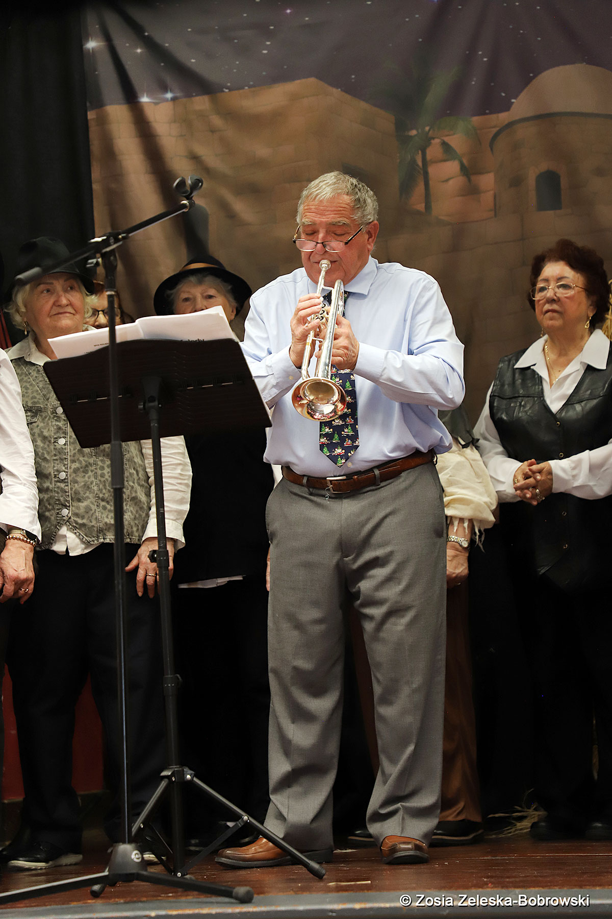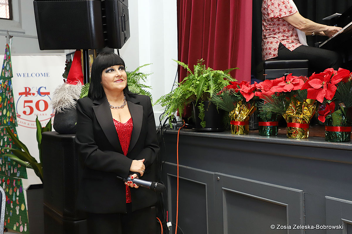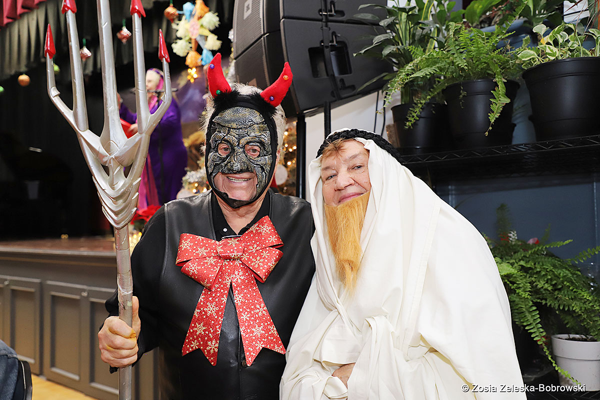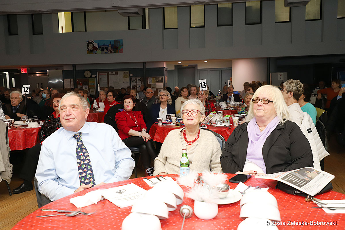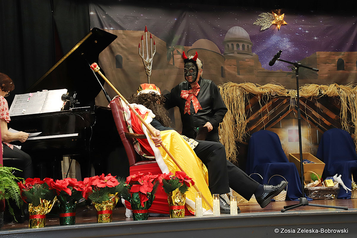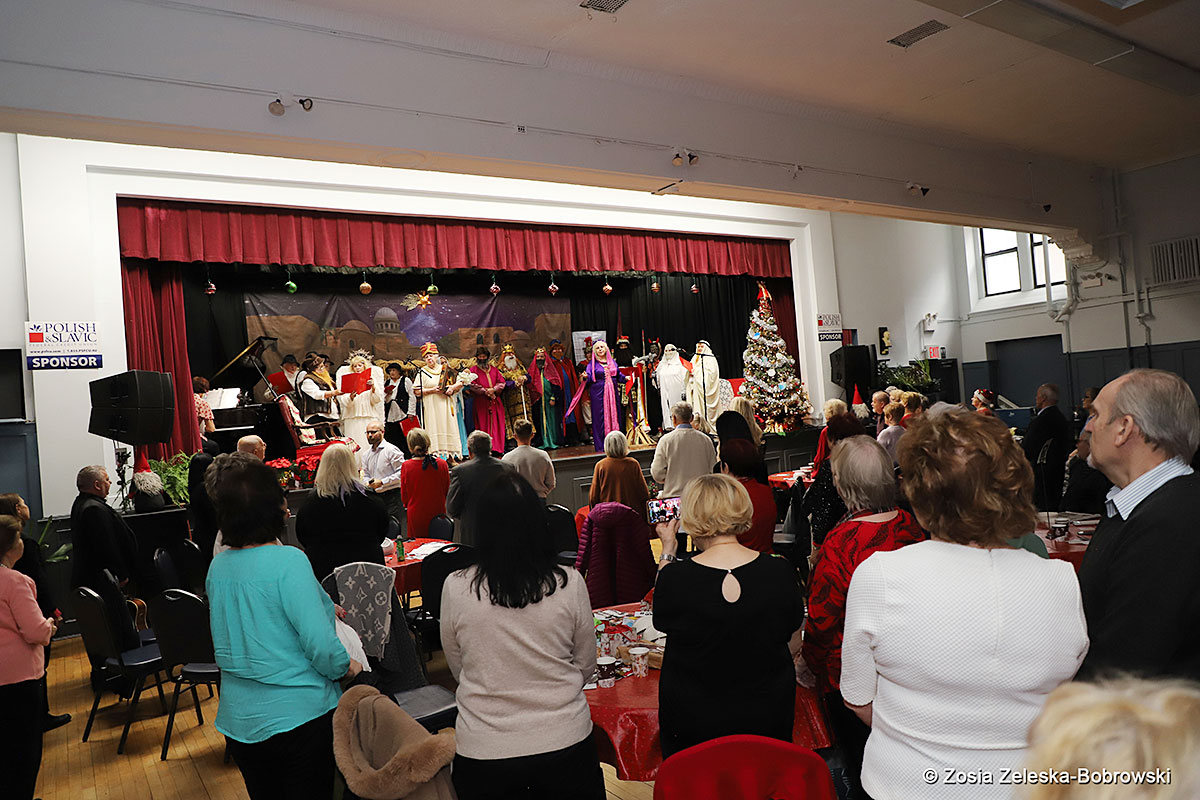 However, the “Nativity play” was not the end of the carol singing at the “Krakus” Senior Center. The president of the Polish and Slavic Center, Pawel Pachacz, unexpectedly appeared on the stage and played three carols on the trumpet so beautifully that all the choir members joined him. If anyone thinks that this is the end of surprises, they are very wrong. Another unexpected guest and envoy with the message of the birth of the Lord on the stage was parish priest Grzegorz Markulak, who played the guitar and sang more carols. And the true Magic of Polish Christmas reigned, and everyone on the stage and the audience united into one big family, which praised the birth of Jesus in the manger.