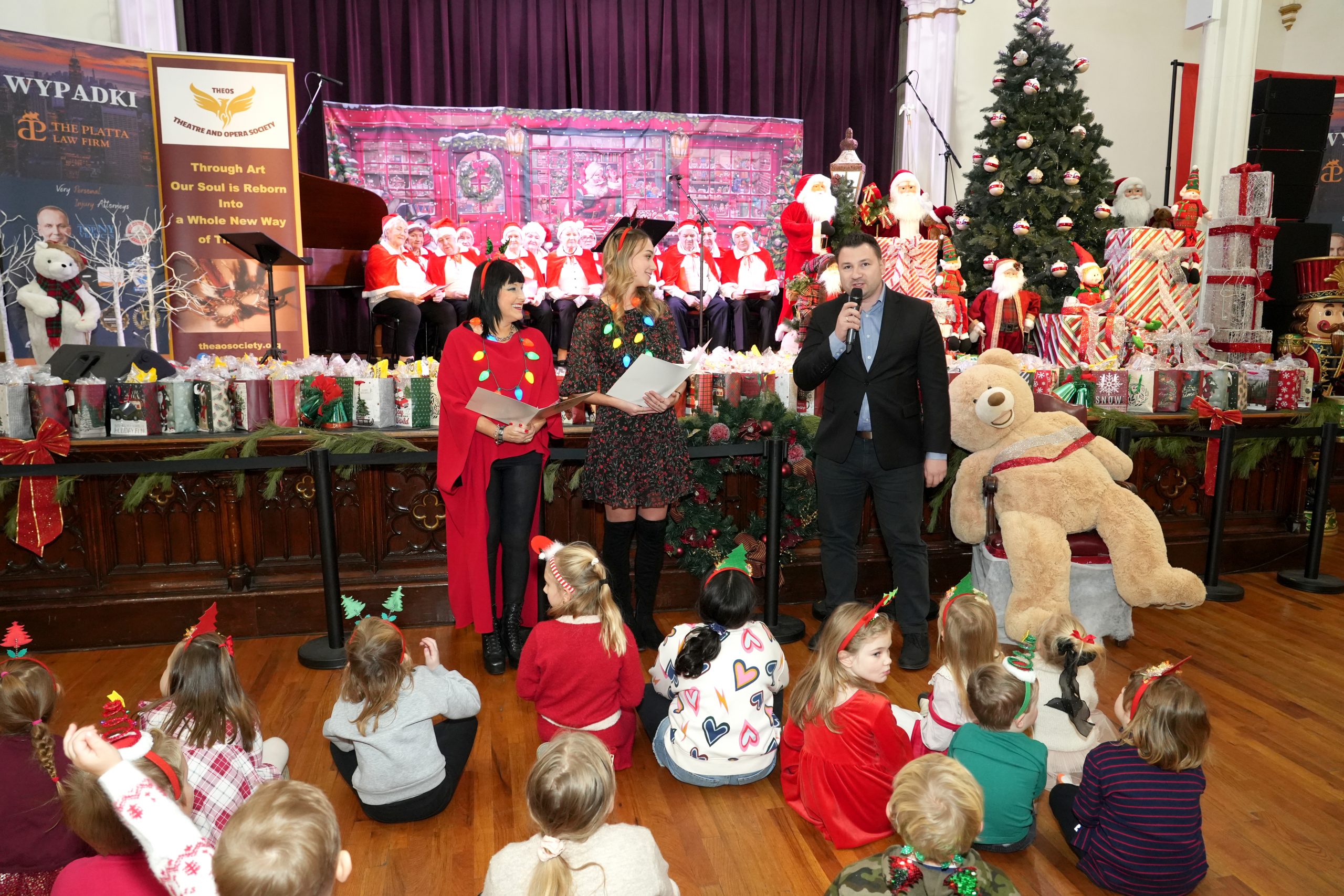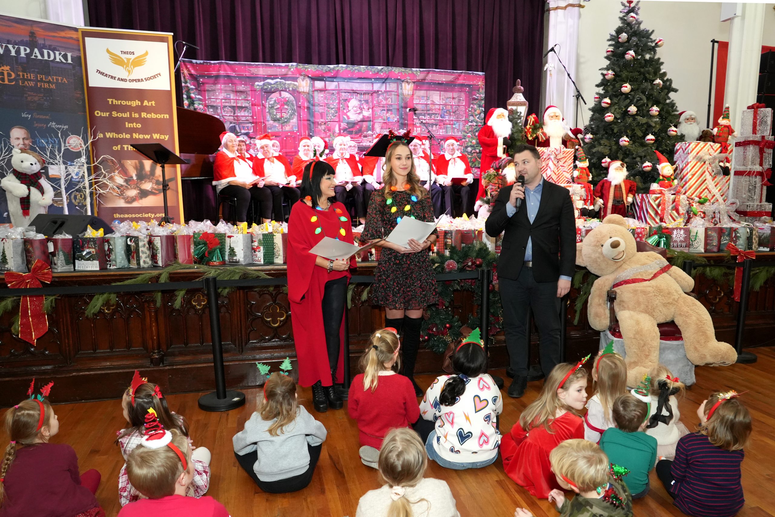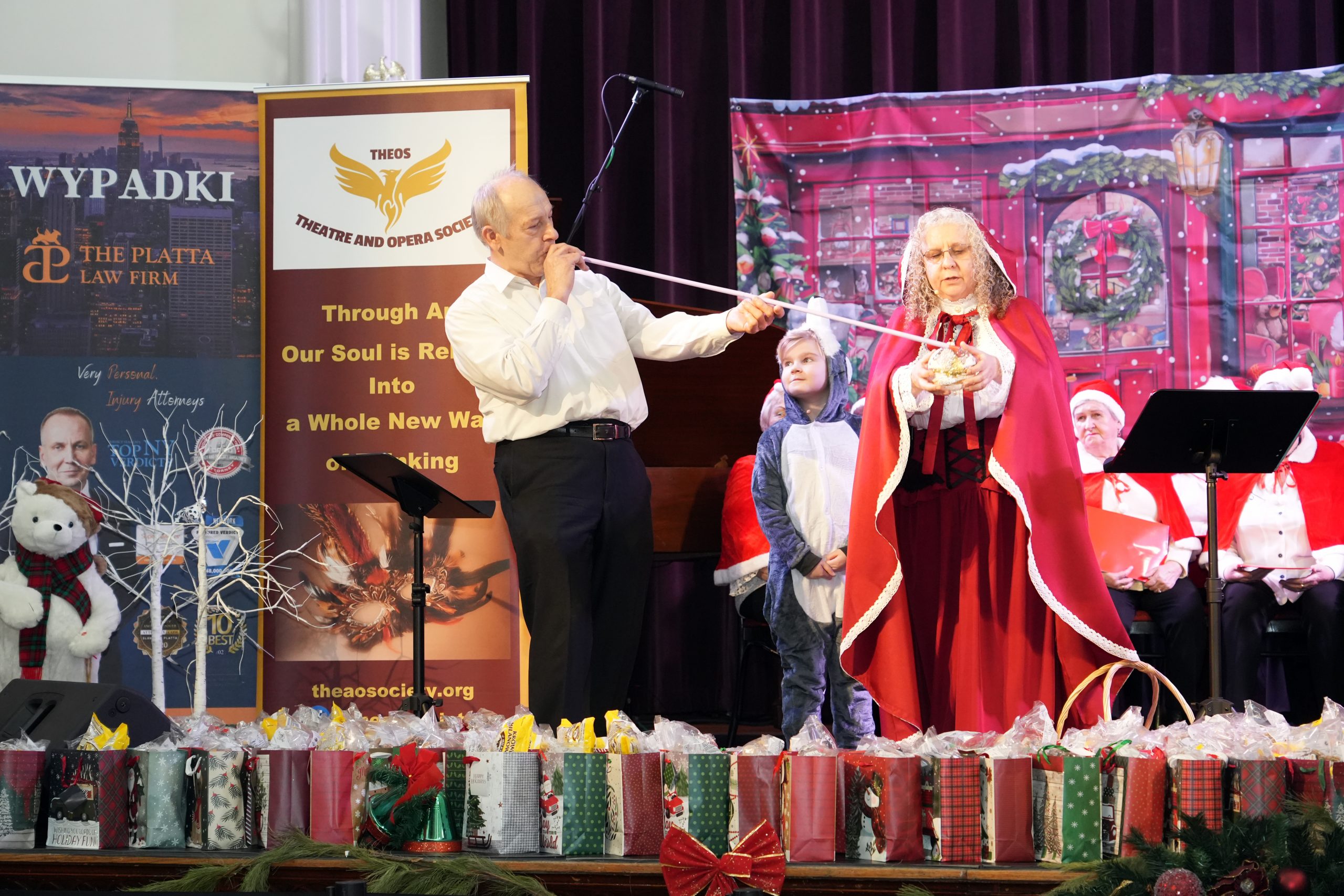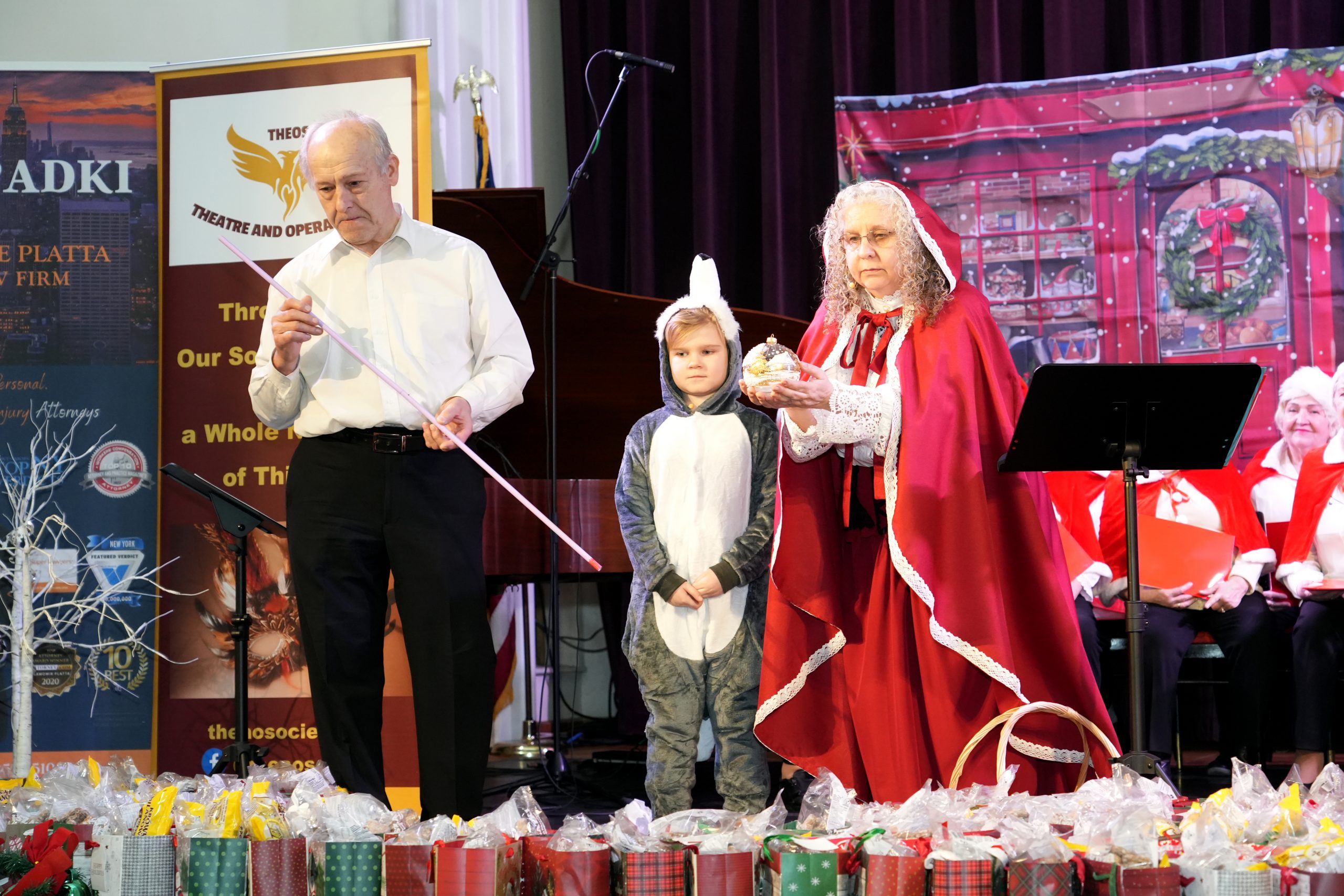 On Friday, December 6, 2024, in the charmingly decorated Gallery of the Polish-Slavic Center in Brooklyn, CP-S Executive Director Agnieszka Granatowska and assistant Claudia Nytko welcomed the guests. The honorary guest was Vice Consul Krzysztof Płaski from the Consulate General of the Republic of Poland in Manhattan, who arrived with his wife and son. The consul welcomed the gathered with great frequency, traditions about traditions related to Christmas and family gatherings. We wished everyone a happy holiday and joyful fun together. The Krakus Choir characteristic of CPS with Katarzyna Drucker – the conductor of this choir, the main Polish soprano, director and founder of the THEOS Theatre and Opera Society also graced the event. Mrs. Kasia, as the moderator of the entire meeting, prepared an excellent theatre performance for children together with her theatre “The Story of the Christmas Bauble”. Little Red Riding Hood appeared on the spot – Kasia Drucker with a basket available for your grandmother. Suddenly, the Wolf appears, who is the result of the excellent play of Andrzej Michoń, our independent actor and vocally Polish artist. Despite a small misunderstanding, Little Red Riding Hood with the Wolf, presented the story of Hans Greiner, who worked in the Glassworks in the German city of Lauscha. The worker of the glassworks was very poor, and could not afford expensive cookies, candies, apples, nuts and other delicacies, which were then used to decorate Christmas trees. As the legend goes, he came up with the idea of ​​repairing the glass decorations in the factory, which was made. He took the terminal device and a metal pipe, made of steel, at the end of the connected device and started and blew until it formed balls, to golden apples and hung them on branches. The road from fruit and homemade baking to glass decorations, which we know to this day, was long. The first Christmas tree baubles in 1847 and were the work of Hans Greiner, an employee of the glassworks in the German city of Lauscha. The children listened attentively to the story.
