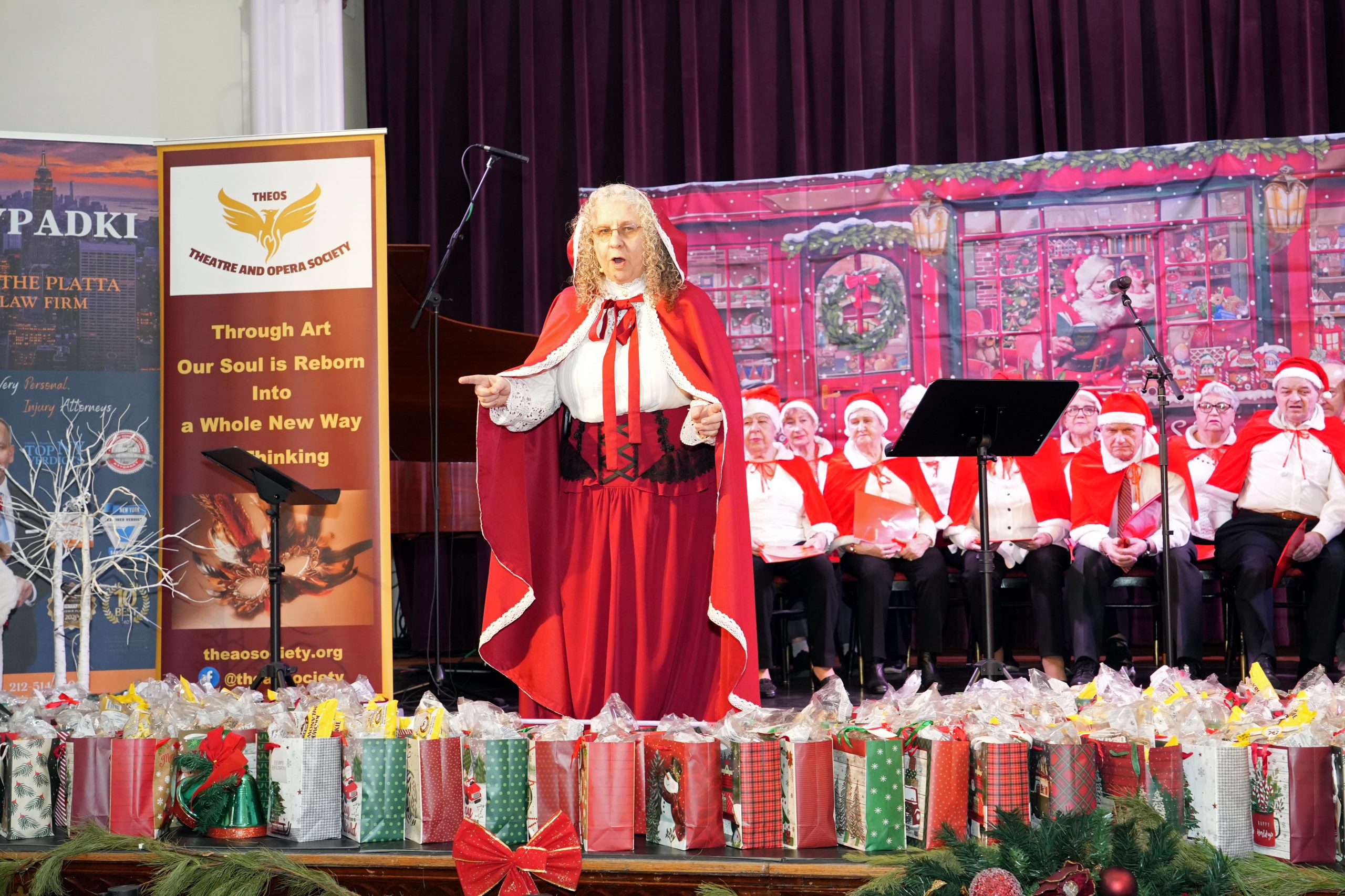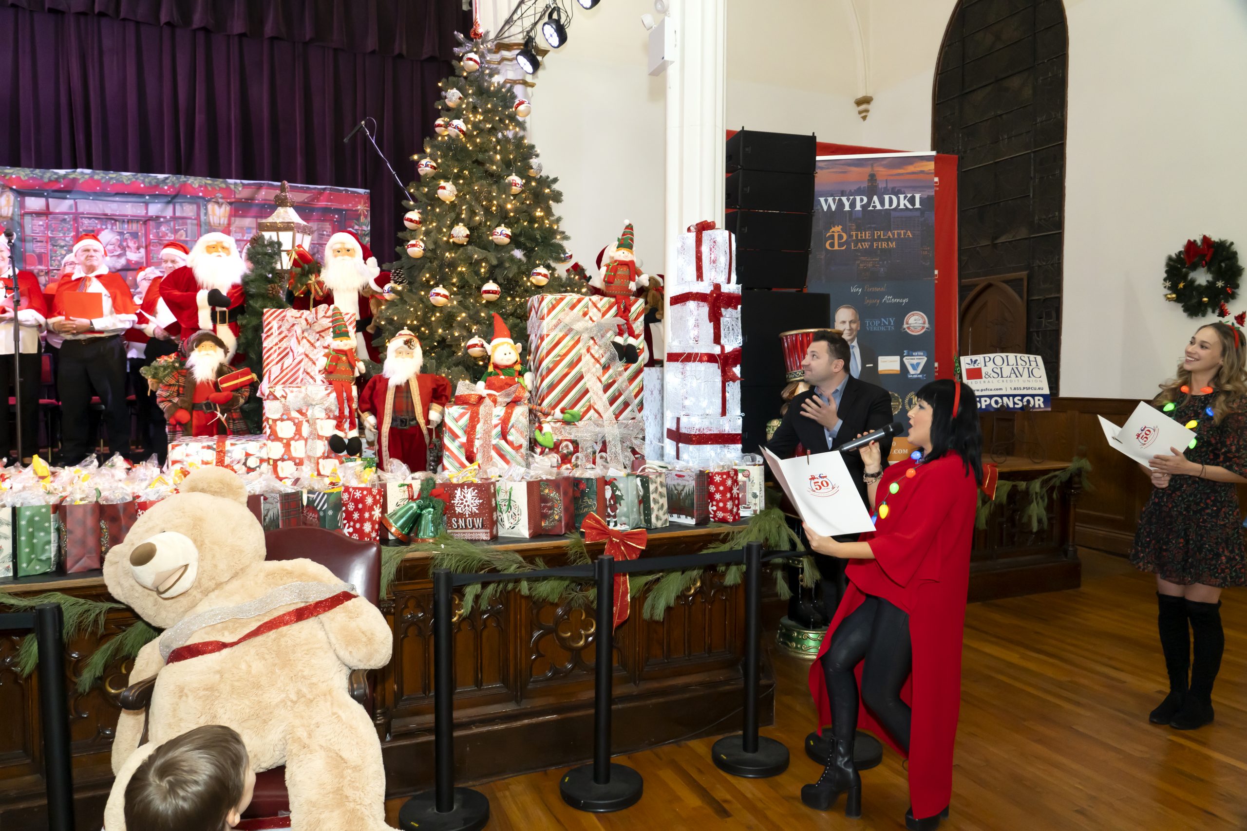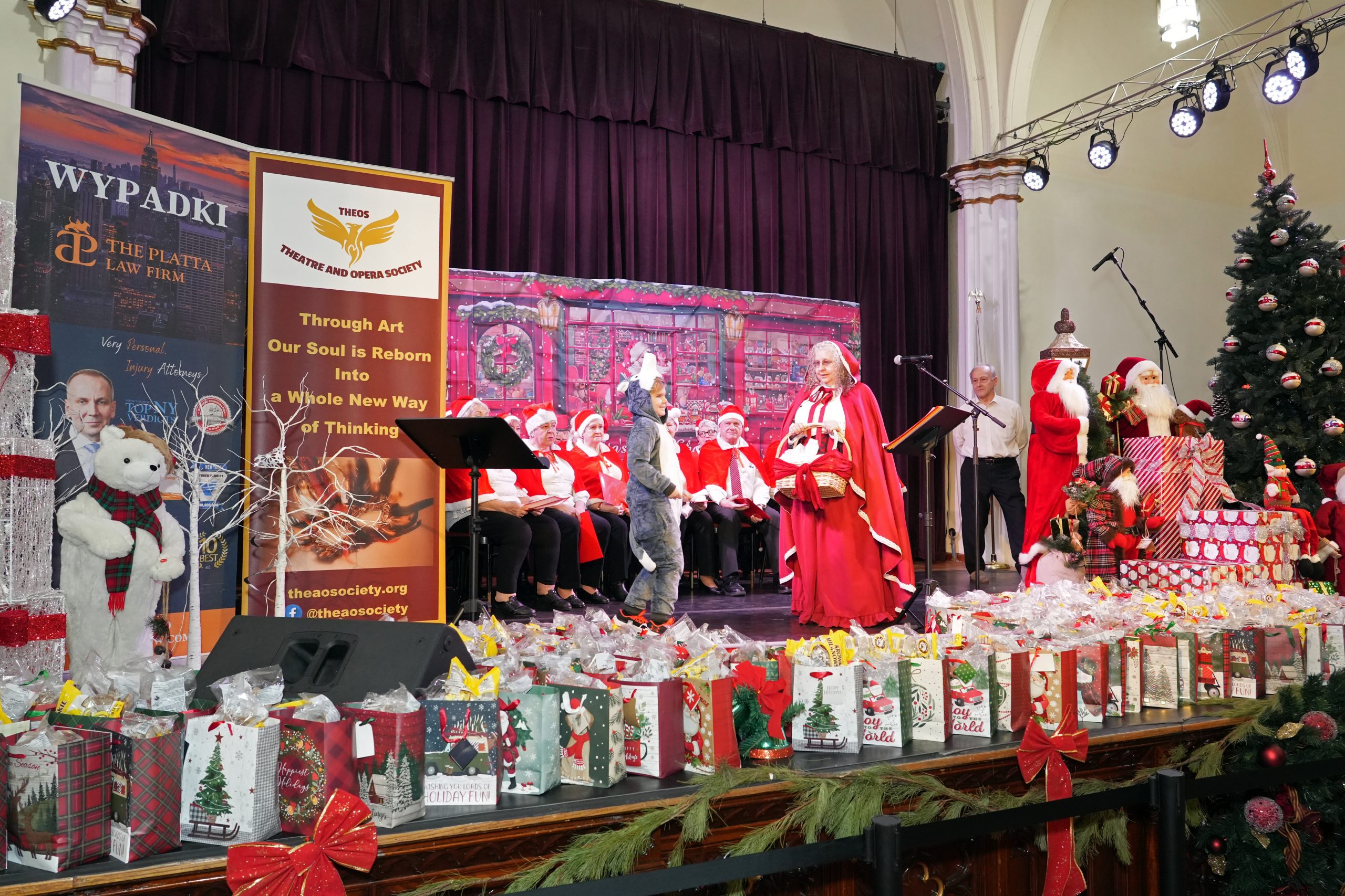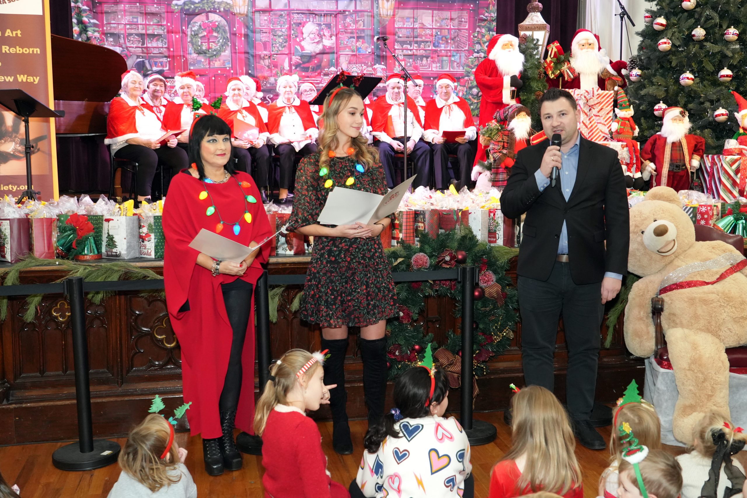 On Friday, December 6, 2024, in the charmingly decorated Gallery of the Polish-Slavic Center in Brooklyn, CP-S Executive Director Agnieszka Granatowska and assistant Claudia Nytko welcomed the guests. The honorary guest was Vice Consul Krzysztof Płaski from the Consulate General of the Republic of Poland in Manhattan, who arrived with his wife and son. The consul welcomed the gathered with great frequency, traditions about traditions related to Christmas and family gatherings. We wished everyone a happy holiday and joyful fun together. The Krakus Choir characteristic of CPS with Katarzyna Drucker – the conductor of this choir, the main Polish soprano, director and founder of the THEOS Theatre and Opera Society also graced the event. Mrs. Kasia, as the moderator of the entire meeting, prepared an excellent theatre performance for children together with her theatre “The Story of the Christmas Bauble”. Little Red Riding Hood appeared on the spot – Kasia Drucker with a basket available for your grandmother. Suddenly, the Wolf appears, who is the result of the excellent play of Andrzej Michoń, our independent actor and vocally Polish artist. Despite a small misunderstanding, Little Red Riding Hood with the Wolf, presented the story of Hans Greiner, who worked in the Glassworks in the German city of Lauscha. The worker of the glassworks was very poor, and could not afford expensive cookies, candies, apples, nuts and other delicacies, which were then used to decorate Christmas trees. As the legend goes, he came up with the idea of ​​repairing the glass decorations in the factory, which was made. He took the terminal device and a metal pipe, made of steel, at the end of the connected device and started and blew until it formed balls, to golden apples and hung them on branches. The road from fruit and homemade baking to glass decorations, which we know to this day, was long. The first Christmas tree baubles in 1847 and were the work of Hans Greiner, an employee of the glassworks in the German city of Lauscha. The children listened attentively to the story.
