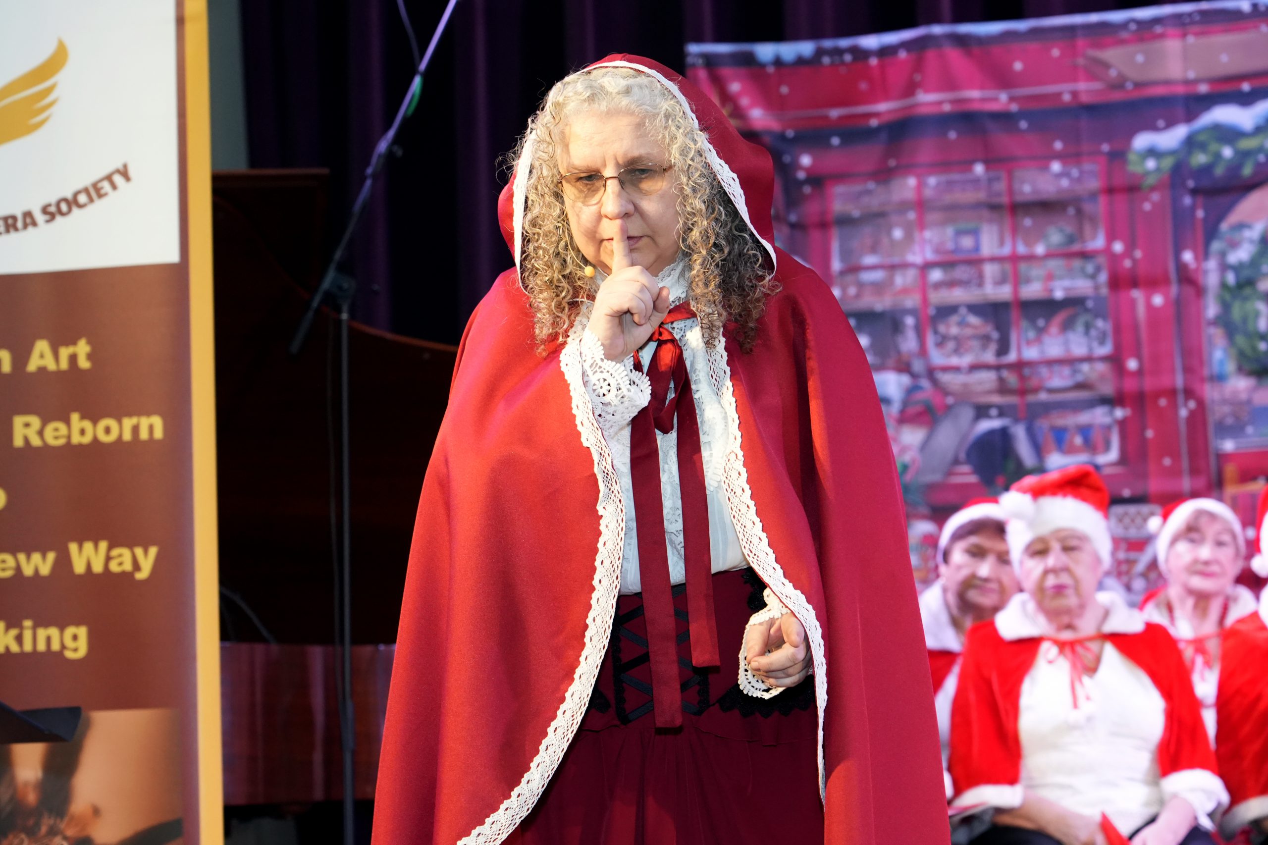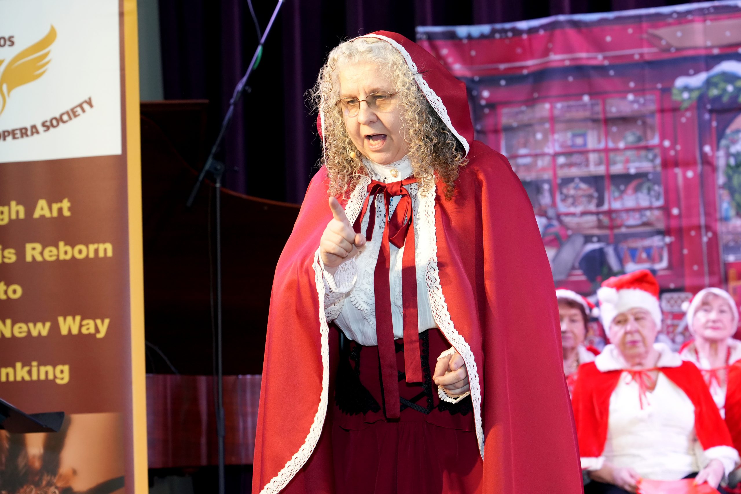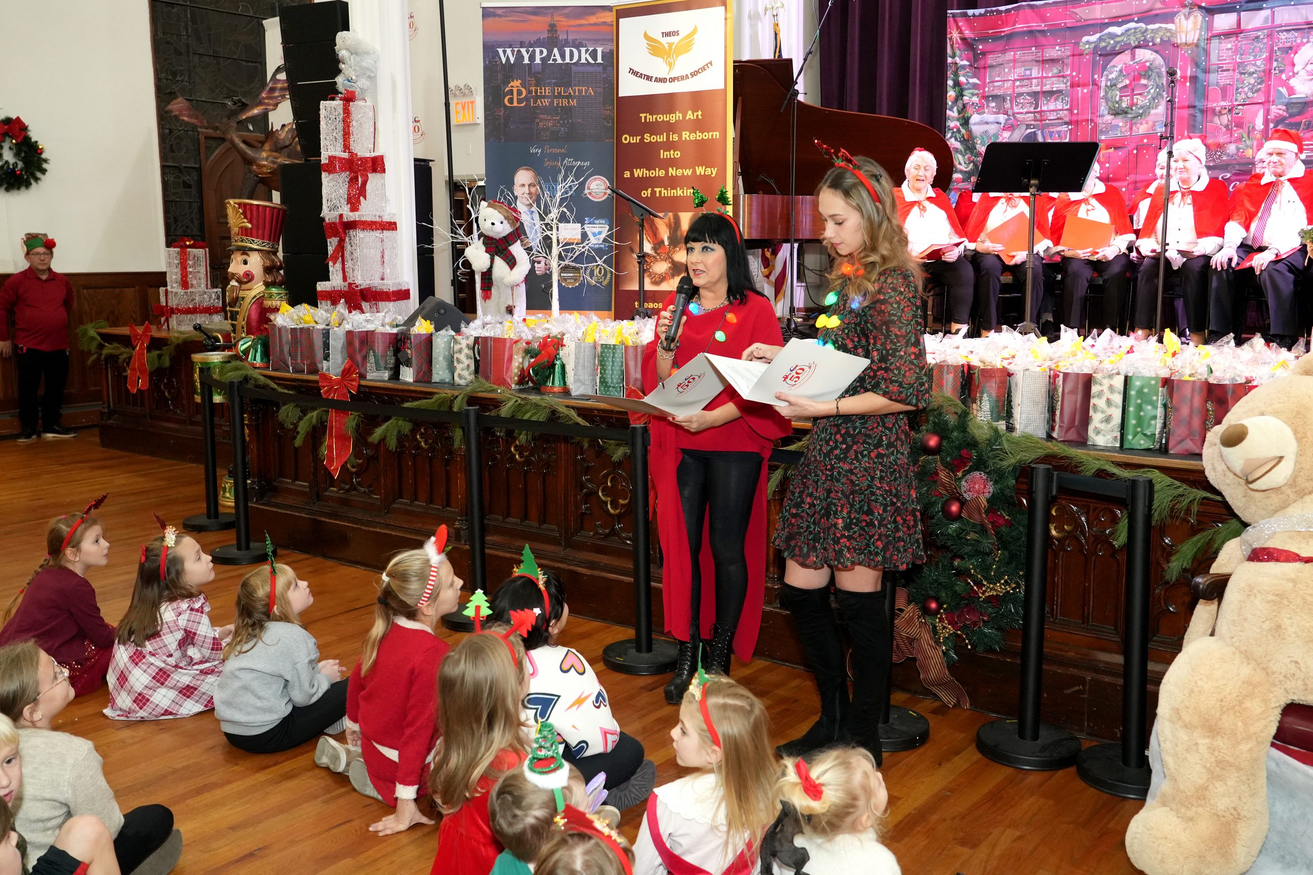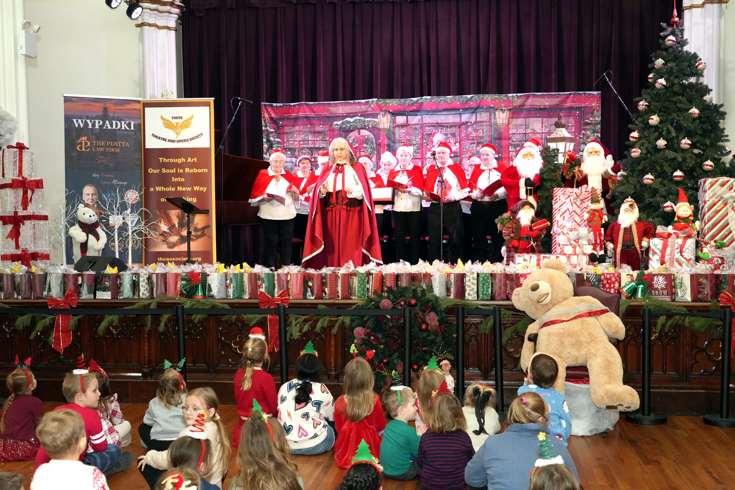 On Friday, December 6, 2024, in the charmingly decorated Gallery of the Polish-Slavic Center in Brooklyn, CP-S Executive Director Agnieszka Granatowska and assistant Claudia Nytko welcomed the guests. The honorary guest was Vice Consul Krzysztof Płaski from the Consulate General of the Republic of Poland in Manhattan, who arrived with his wife and son. The consul welcomed the gathered with great frequency, traditions about traditions related to Christmas and family gatherings. We wished everyone a happy holiday and joyful fun together. The Krakus Choir characteristic of CPS with Katarzyna Drucker – the conductor of this choir, the main Polish soprano, director and founder of the THEOS Theatre and Opera Society also graced the event. Mrs. Kasia, as the moderator of the entire meeting, prepared an excellent theatre performance for children together with her theatre “The Story of the Christmas Bauble”. Little Red Riding Hood appeared on the spot – Kasia Drucker with a basket available for your grandmother. Suddenly, the Wolf appears, who is the result of the excellent play of Andrzej Michoń, our independent actor and vocally Polish artist. Despite a small misunderstanding, Little Red Riding Hood with the Wolf, presented the story of Hans Greiner, who worked in the Glassworks in the German city of Lauscha. The worker of the glassworks was very poor, and could not afford expensive cookies, candies, apples, nuts and other delicacies, which were then used to decorate Christmas trees. As the legend goes, he came up with the idea of ​​repairing the glass decorations in the factory, which was made. He took the terminal device and a metal pipe, made of steel, at the end of the connected device and started and blew until it formed balls, to golden apples and hung them on branches. The road from fruit and homemade baking to glass decorations, which we know to this day, was long. The first Christmas tree baubles in 1847 and were the work of Hans Greiner, an employee of the glassworks in the German city of Lauscha. The children listened attentively to the story.