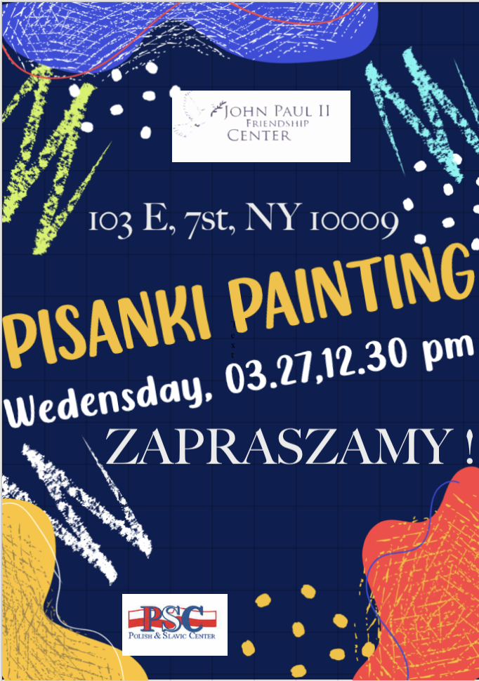 On Wednesday 03.27.2024 at 12.30 pm  there will be a class of Easter Eggs decoration making laouched in collboration with our neighebrhood Settlement Village NORC Center Director: Sofiya Pidzyralo. Welcome