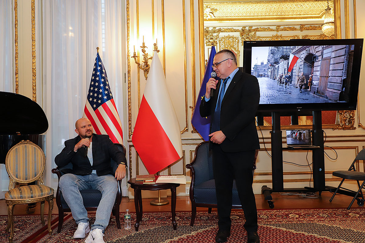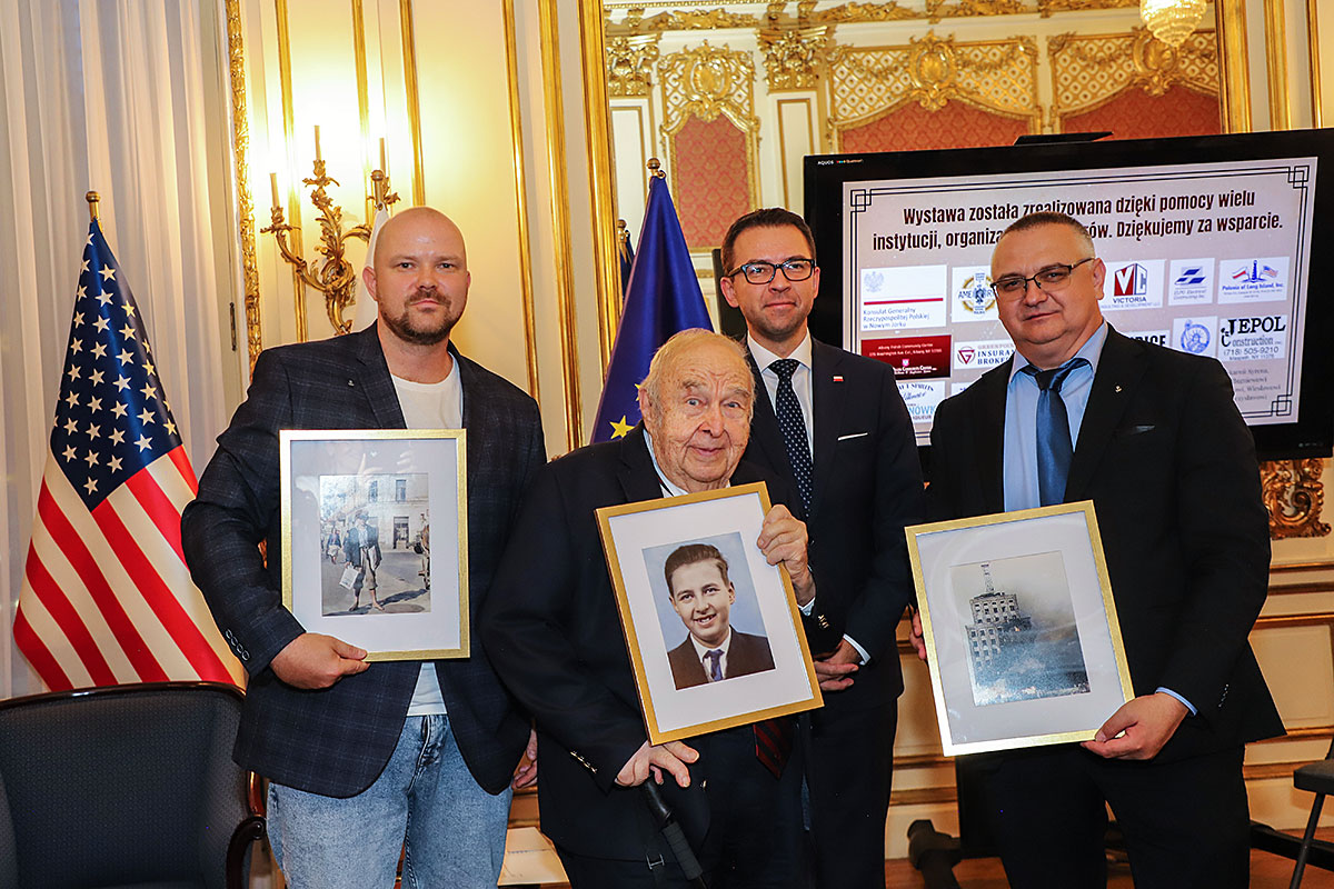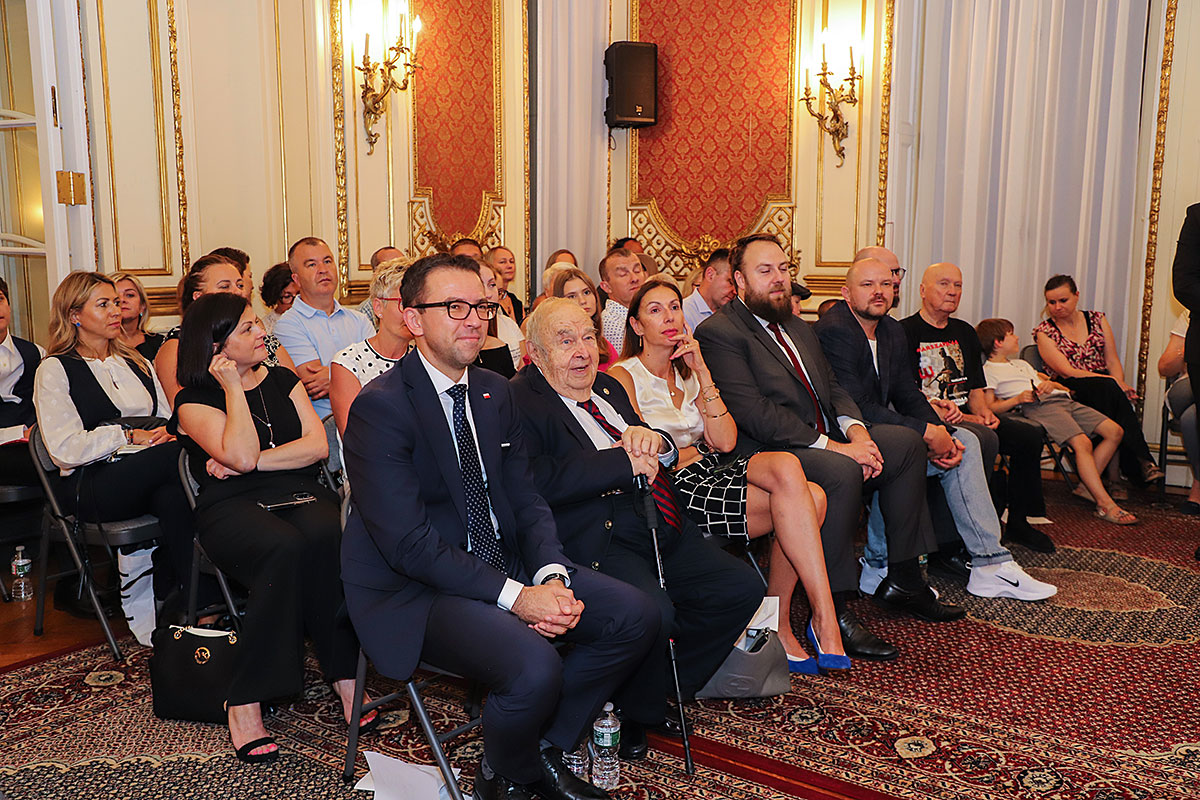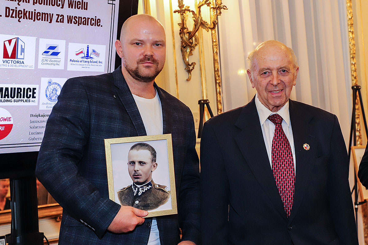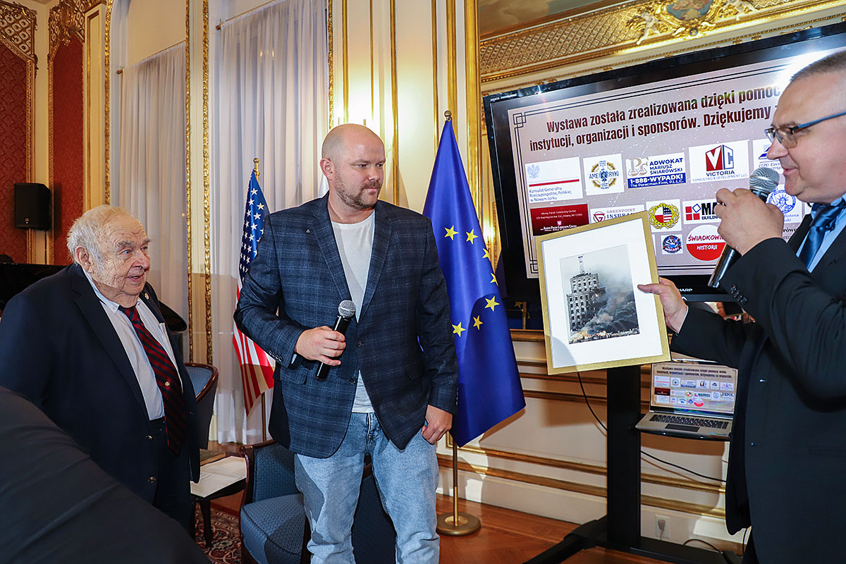 The guests of honor at the ceremony were: Andrzej Rawicz, a Warsaw Uprising participant, and the aforementioned colorist, Mikołaj Kaczmarek, who flew in from Poland especially for the occasion. After the Polish national anthem was sung by Hanna Pogorzelska, this year’s Miss Polonia from Ridgewood, Wojciech Maślanka conducted a conversation with 90-year-old Andrzej Rawicz from Pennsylvania. He talked about his happy childhood before the war, and recalled how, risking his life as a ten-year-old, he distributed a bulletin in Warsaw. He also talked about his family, his mother Krystyna Rawicz-Szabuniewicz, who was active in the Home Army during the war, and his father Józef Rawicz-Szabuniewicz, a Polish and British air force officer, as well as his grandfather Bronisław Ratajczak, who in the first days of the uprising, after conquering the then skyscraper – Prudential, hung a white and red flag on its top. Unfortunately, he died after their tenement house was bombed on September 5, 1944. He also recalled escaping from the train that, together with his grandmother, cousin, aunt, and other insurgents and residents of Warsaw, was sent to the KL Auschwitz concentration camp.