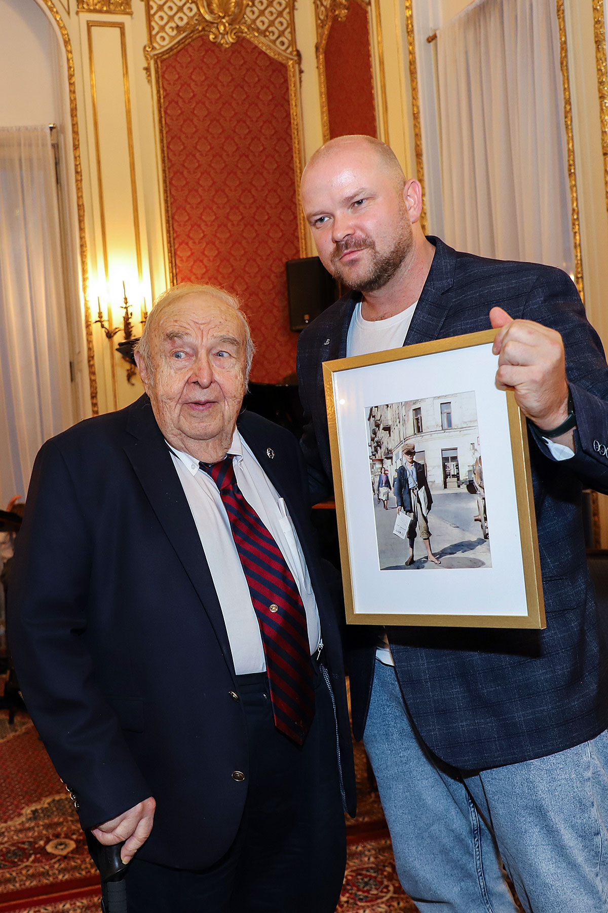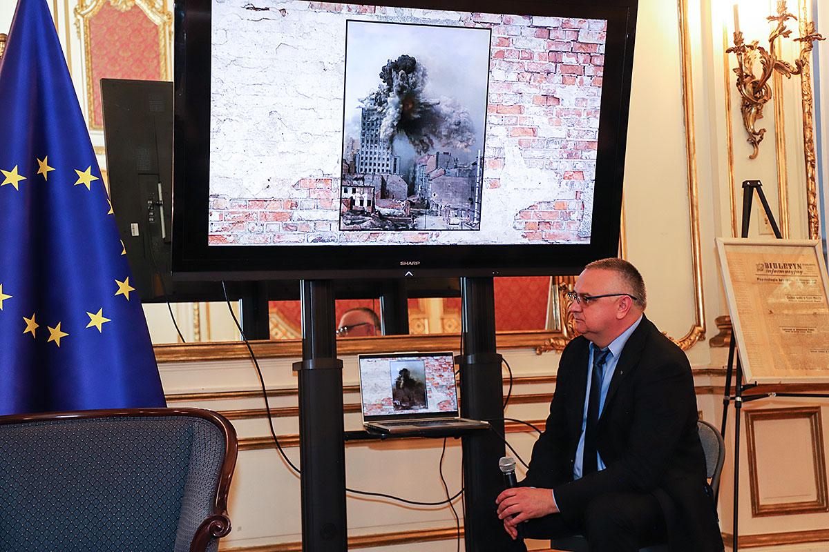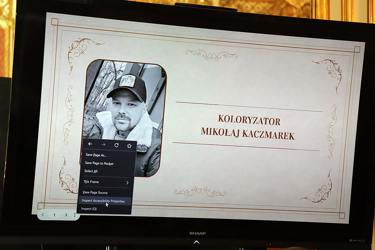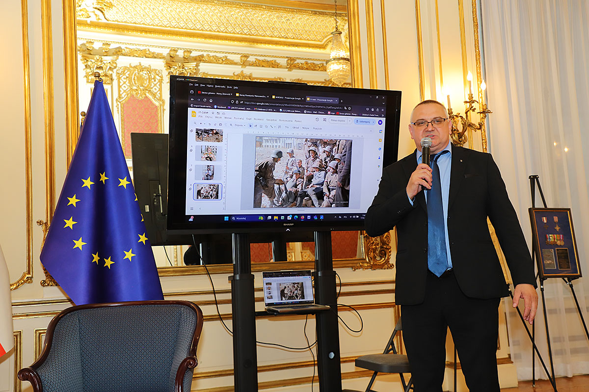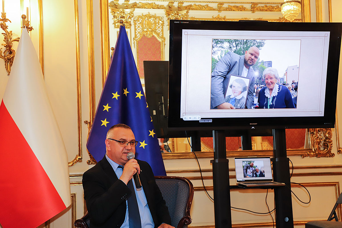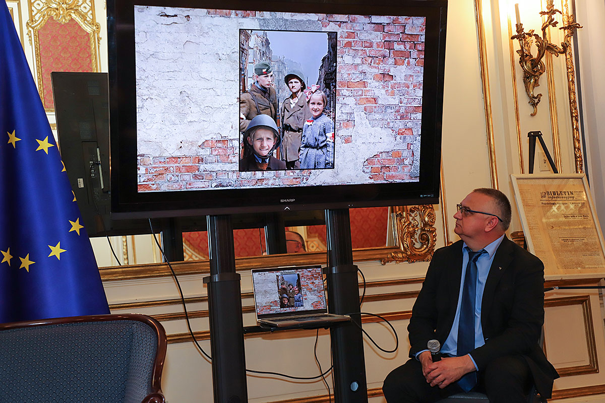 Next, Wojciech Maślanka spoke with Mikołaj Kaczmarek, the colorist of the presented insurgent photos. He talked about the technique of colorizing photos and recalled moving meetings with insurgents who were still alive. The first photo he colored was a girl from the Warsaw Uprising, which he found on the Internet. The girl kneels in the yard, where a cemetery has been made and her brother is buried. The colorist has already received many awards for his patriotic work and social activity to popularize history, including the BohaterOn Award of the Warsaw Insurgents, the ZHP Medal and the Cross of Merit of the Republic of Poland. The conversation was accompanied by an interesting presentation of colorized photos and from the artist’s meetings with insurgents, prepared by Nicola Gabriela Maślanka. Mikołaj Kaczmarek prepared a surprise, he presented colored family photos to Andrzej Rawicz and Janusz Romański, son of insurgent Lt. Roman Romański, commander of the “Żbik” group.