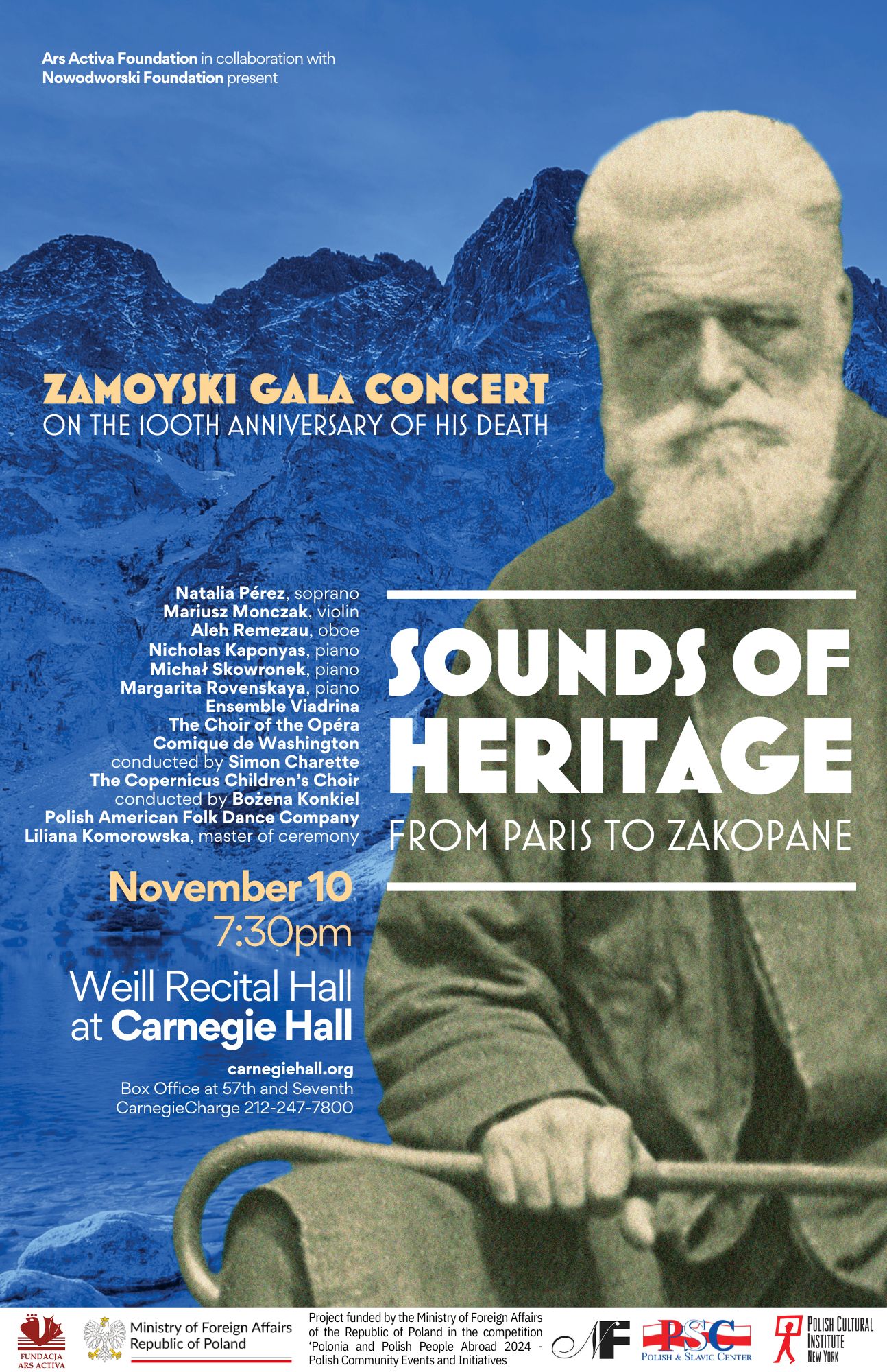 This concert is organized by Fundacja Ars Activa and the Nowodworski Foundation, with funding from the Ministry of Foreign Affairs of the Republic of Poland as part of the Polonia and Polish People Abroad 2024 initiative.